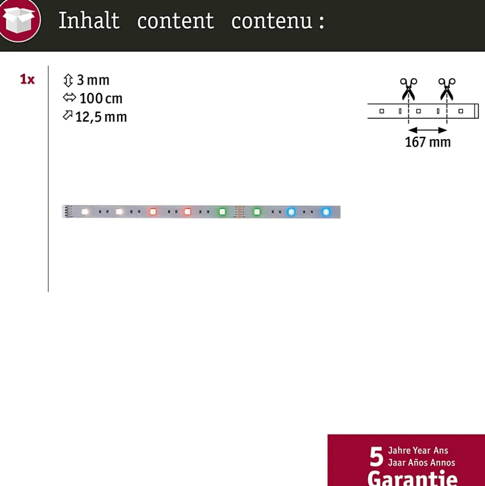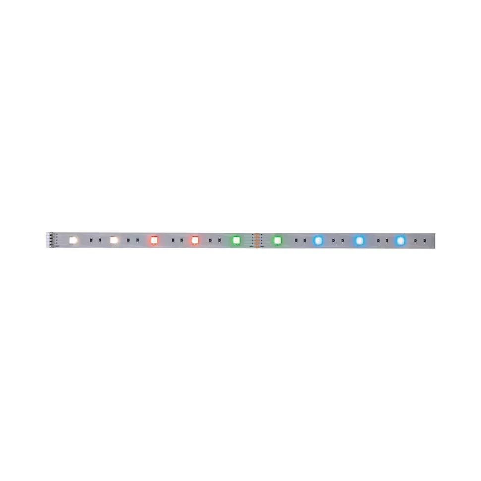 Ce Strip MaxLED 250 d’une longueur de 1m est le complément parfait du kit de base. Avec 7 watts, les Strips MaxLED sont si puissants qu’ils peuvent être utilisés sans problème comme éclairage d’intérieur. Ils sont particulièrement impressionnants dans les profilés. Grâce à la commande de couleur, vous pouvez créer une ambiance personnalisée, que ce soit un éclairage permanent monochrome ou des effets lumineux multicolores. Une diode blanche (W) assure de plus une confortable lumière blanc chaud et rend superflu le mélange d’un ton blanc avec les couleurs rouge, vert et bleu (RGB).