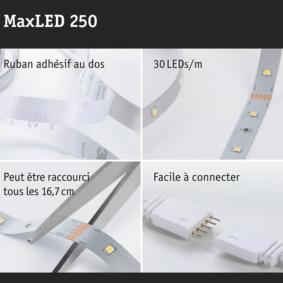 Rubans individuels|Pour extension des kits de base MaxLED|Peut être raccourci en fonction de la longueur souhaitée|Face arrière autocollante pour un montage simple|Matériel flexible pour le montage sur des surfaces planes ou courbes|Changement de couleur RGB|La technologie LED fait économiser jusqu’à 80 % d’énergie par rapport aux ampoules à incandescence classiques.|Inclus le connecteur à 5 broches pour une connexion simple au ruban|Gradable avec le contrôleur RGB MaxLED|Montage simple par système de connexion
