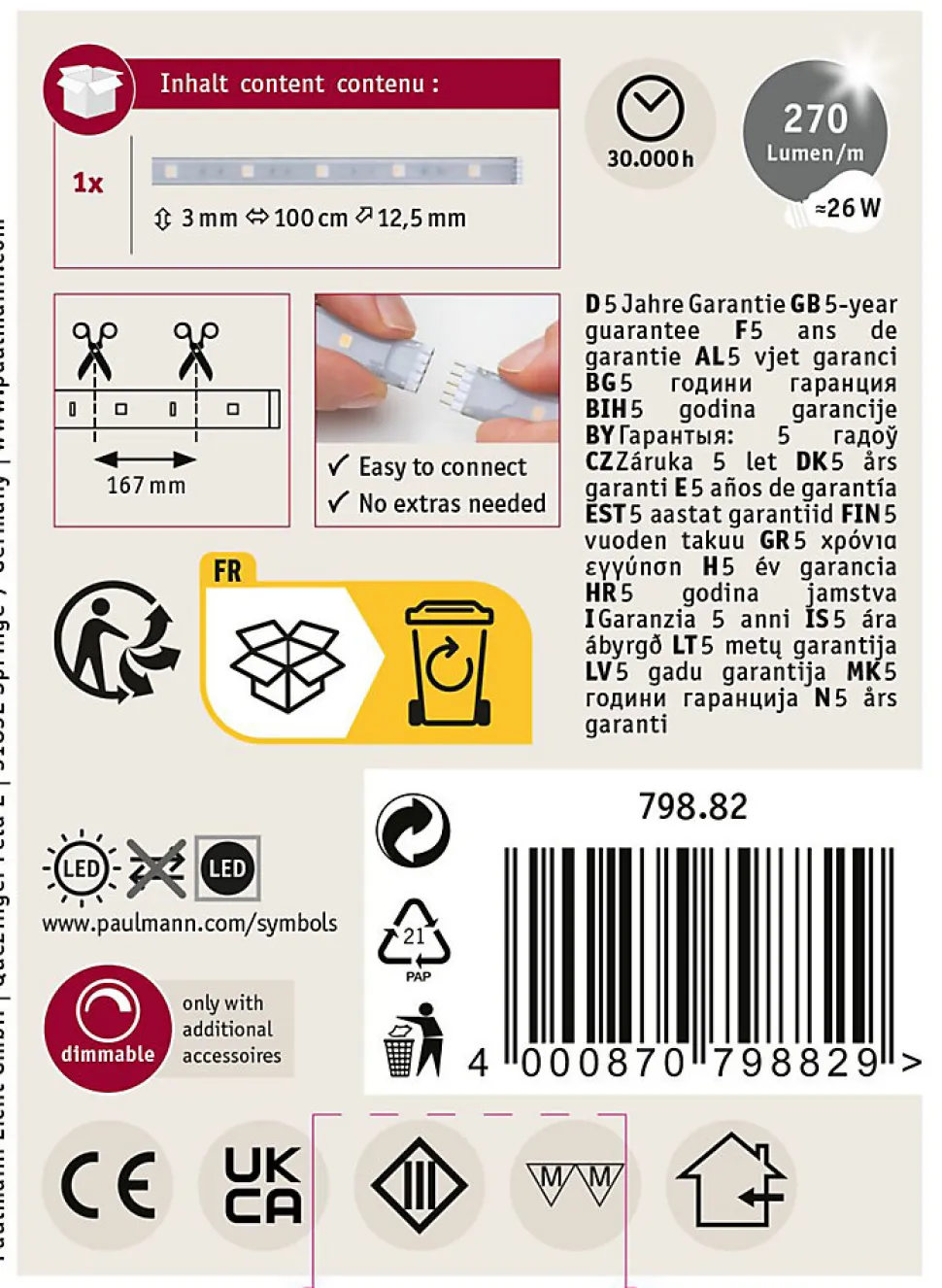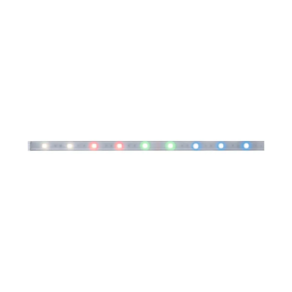 Ce Strip MaxLED 250 d’une longueur de 1m est pourvu du gainage IP44 nouvelle génération « Protecting Cover », ce qui en fait l’équipement idéal pour les pièces humides. Il est le complément parfait du kit de base. Avec 7 watts, les Strips MaxLED sont si puissants qu’ils peuvent être utilisés sans problème comme éclairage d’intérieur. Ils sont particulièrement impressionnants dans les profilés. Grâce à la commande de couleur, vous pouvez créer une ambiance personnalisée, que ce soit un éclairage permanent monochrome ou des effets lumineux multicolores. Une diode blanche (W) assure de plus une confortable lumière blanc chaud et rend superflu le mélange d’un ton blanc avec les couleurs rouge, vert et bleu (RGB).