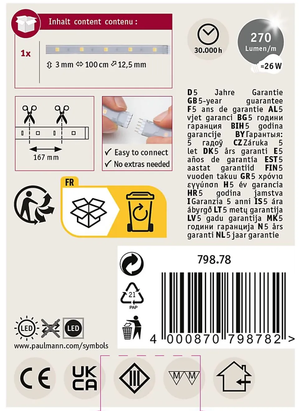 Ce Strip MaxLED 250 d’une longueur de 1m est pourvu du gainage IP44 nouvelle génération « Protecting Cover », ce qui en fait l’équipement idéal pour les pièces humides. Il est le complément parfait du kit de base. Avec 4 watts, les Strips MaxLED sont si puissants qu’ils peuvent être utilisés sans problème comme éclairage d’intérieur. Ils sont particulièrement impressionnants dans les profilés. Grâce à la commande de la lumière blanche intelligente Tunable White, vous personnalisez la température de couleur du strip, du blanc lumière du jour de l’éclairage de travail, au blanc chaud de la lumière de relaxation.