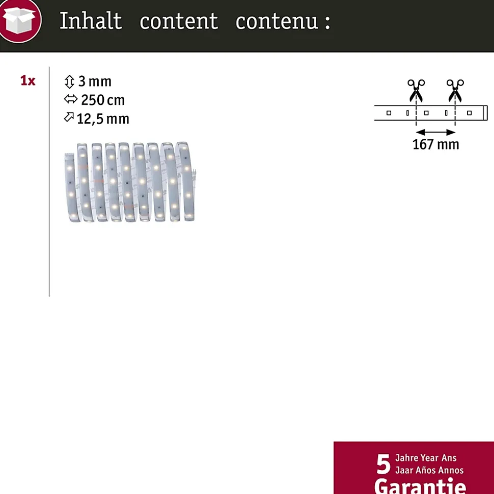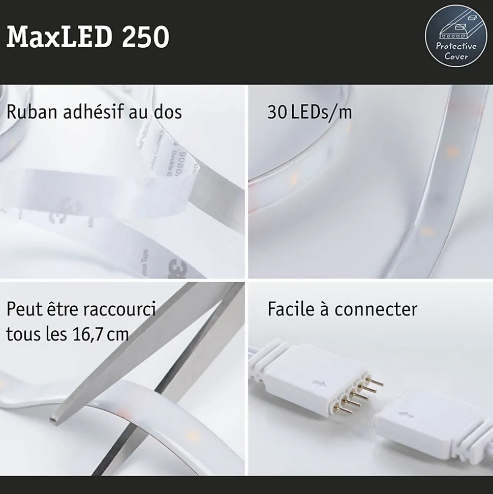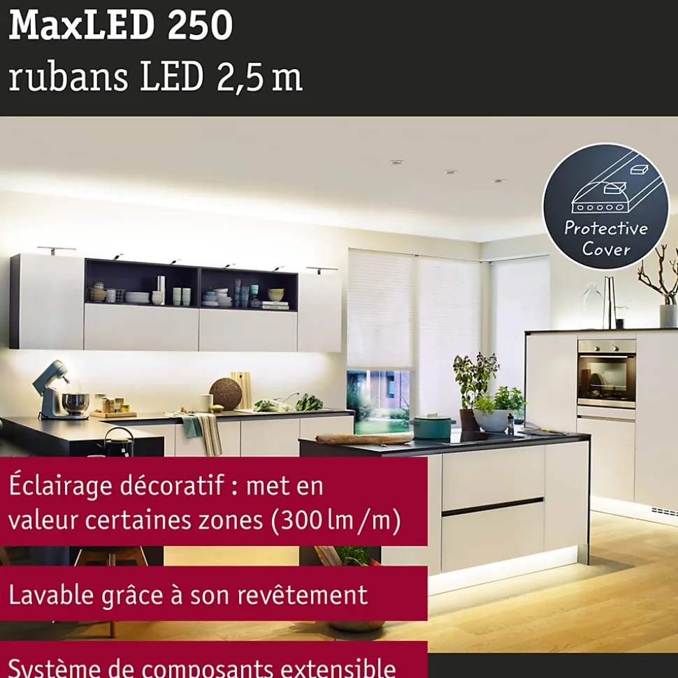 Ce Strip MaxLED 250 d’une longueur de 2,5m est pourvu du gainage IP44 nouvelle génération « Protecting Cover », ce qui en fait l’équipement idéal pour les pièces humides. Il est le complément parfait du kit de base. Avec 10 watts, les Strips MaxLED sont si puissants qu’ils peuvent être utilisés sans problème comme éclairage d’intérieur. Ils sont particulièrement impressionnants dans les profilés. Les strips blanc chaud délivrent un éclairage d’ambiance et fonctionnel agréable et relaxant.