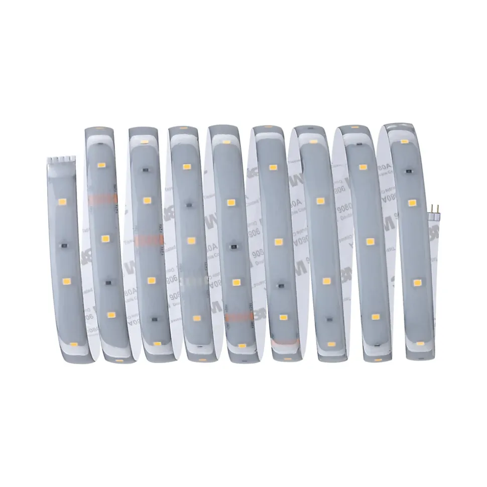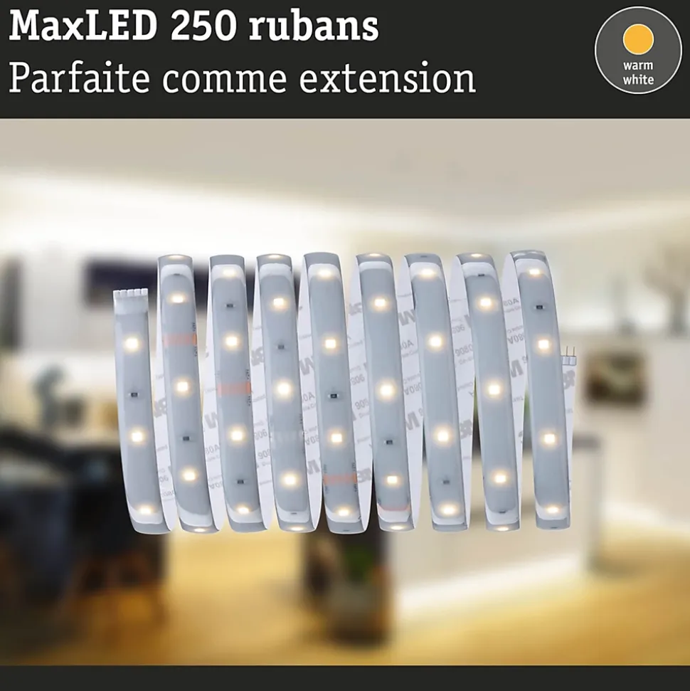 Rubans individuels|Pour extension des kits de base MaxLED|IP44 – Protection contre les projections d’eau, y compris en extérieur|Température de couleur: 2700K – Blanc chaud|Peut être raccourci en fonction de la longueur souhaitée|Face arrière autocollante pour un montage simple|Matériel flexible pour le montage sur des surfaces planes ou courbes|La technologie LED fait économiser jusqu’à 80 % d’énergie par rapport aux ampoules à incandescence classiques.|Montage simple par système de connexion