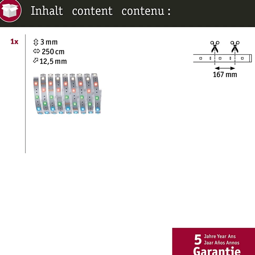 Ce Strip MaxLED 250 d’une longueur de 2,5m est le complément parfait du kit de base. Avec 17 watts, les Strips MaxLED sont si puissants qu’ils peuvent être utilisés sans problème comme éclairage d’intérieur. Ils sont particulièrement impressionnants dans les profilés. Grâce à la commande de couleur, vous pouvez créer une ambiance personnalisée, que ce soit un éclairage permanent monochrome ou des effets lumineux multicolores. Une diode blanche (W) assure de plus une confortable lumière blanc chaud et rend superflu le mélange d’un ton blanc avec les couleurs rouge, vert et bleu (RGB).