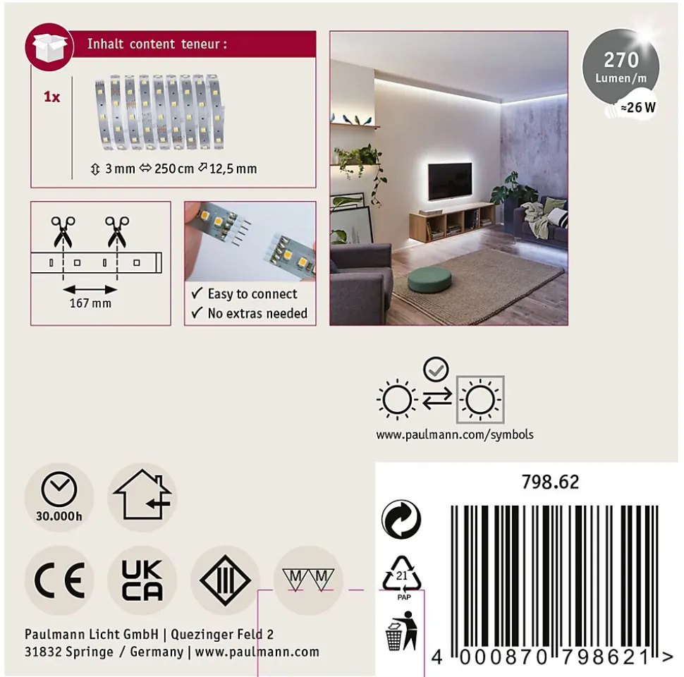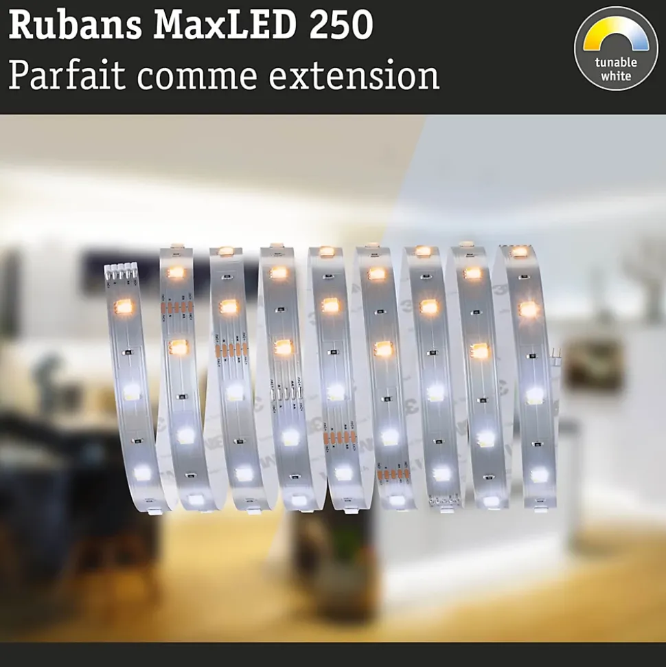Ce Strip MaxLED 250 d’une longueur de 2,5m est le complément parfait du kit de base. Avec 9 watts, les Strips MaxLED sont si puissants qu’ils peuvent être utilisés sans problème comme éclairage d’intérieur. Ils sont particulièrement impressionnants dans les profilés. Grâce à la commande de la lumière blanche intelligente Tunable White, vous personnalisez la température de couleur du strip, du blanc lumière du jour de l’éclairage de travail, au blanc chaud de la lumière de relaxation.