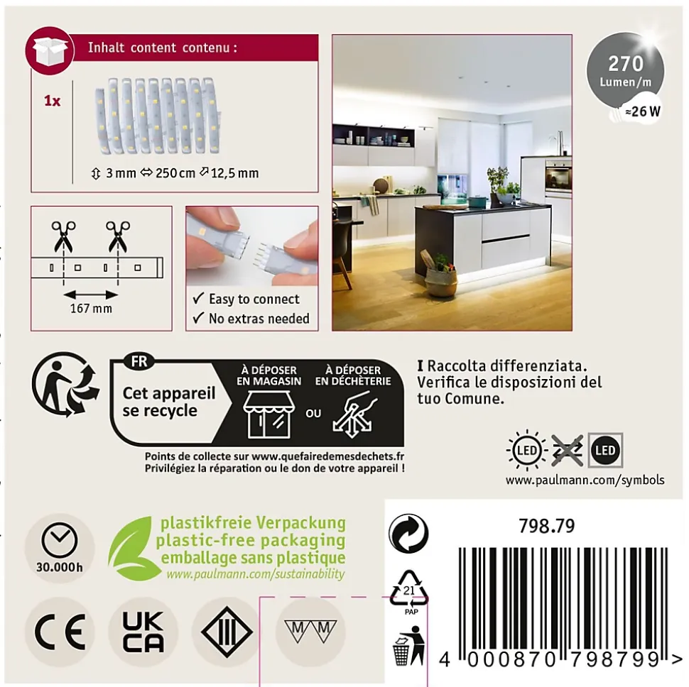 Ce Strip MaxLED 250 d’une longueur de 2,5m est pourvu du gainage IP44 nouvelle génération « Protecting Cover », ce qui en fait l’équipement idéal pour les pièces humides. Il est le complément parfait du kit de base. Avec 9 watts, les Strips MaxLED sont si puissants qu’ils peuvent être utilisés sans problème comme éclairage d’intérieur. Ils sont particulièrement impressionnants dans les profilés. Grâce à la commande de la lumière blanche intelligente Tunable White, vous personnalisez la température de couleur du strip, du blanc lumière du jour de l’éclairage de travail, au blanc chaud de la lumière de relaxation.