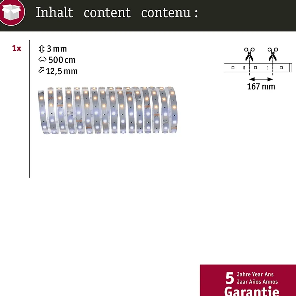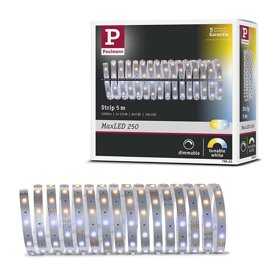 Ce Strip MaxLED 250 d’une longueur de 5m est le complément parfait du kit de base. Avec 17,5 watts, les Strips MaxLED sont si puissants qu’ils peuvent être utilisés sans problème comme éclairage d’intérieur. Ils sont particulièrement impressionnants dans les profilés. Grâce à la commande de la lumière blanche intelligente Tunable White, vous personnalisez la température de couleur du strip, du blanc lumière du jour de l’éclairage de travail, au blanc chaud de la lumière de relaxation.