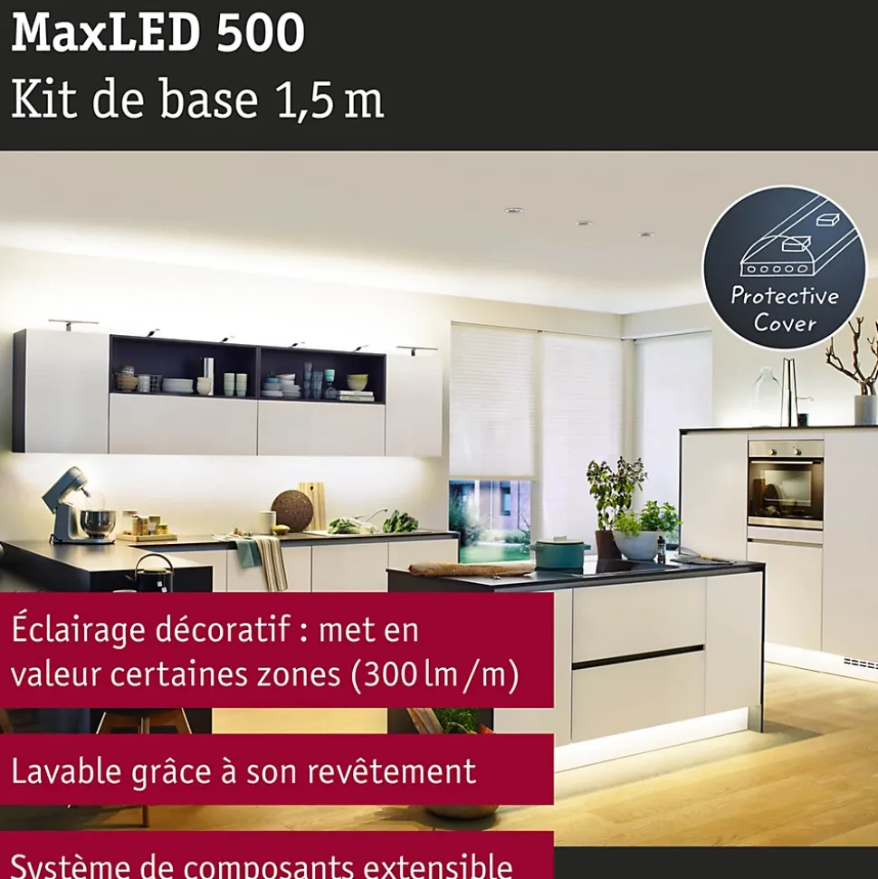 Le kit de base MaxLED 250 comprend en plus des Strips d’une longueur de 1,5m, un ballast électronique adapté. Il est possible, au besoin, d’étendre le système à l’aide d’une unité de commande avec télécommande. Avec son gainage IP44 nouvelle génération « Protecting Cover », le kit de base convient également pour les pièces humides. Avec 6 watts, les Strips MaxLED sont si puissants qu’ils peuvent être utilisés sans problème comme éclairage d’intérieur. Ils sont particulièrement impressionnants dans les profilés. Les strips blanc chaud délivrent un éclairage d’ambiance et fonctionnel agréable et relaxant.