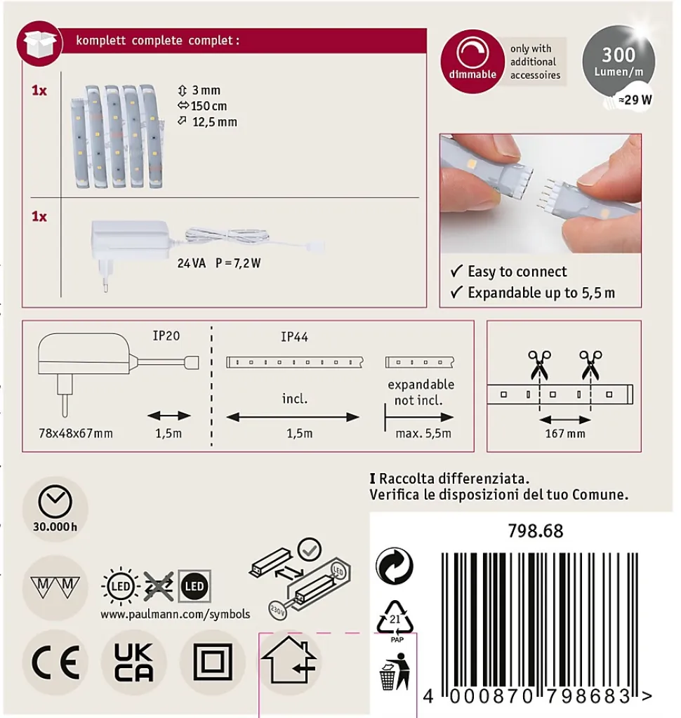 Kit complet avec ruban et alimentation|IP44 – Protection contre les projections d’eau, y compris en extérieur|Température de couleur: 2700K – Blanc chaud|Peut être raccourci en fonction de la longueur souhaitée|Face arrière autocollante pour un montage simple|Matériel flexible pour le montage sur des surfaces planes ou courbes|La technologie LED fait économiser jusqu’à 80 % d’énergie par rapport aux ampoules à incandescence classiques.|Inclus le connecteur à 5 broches pour une connexion simple au ruban|Montage simple par système de connexion