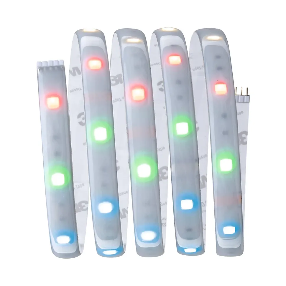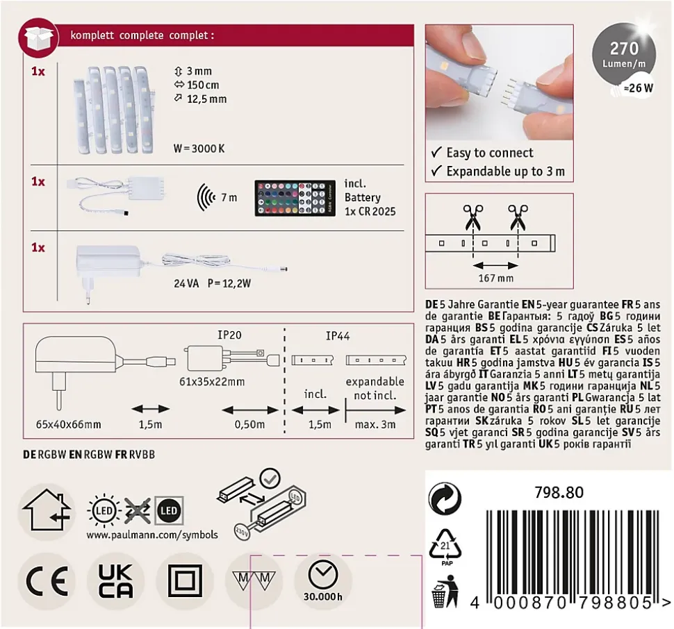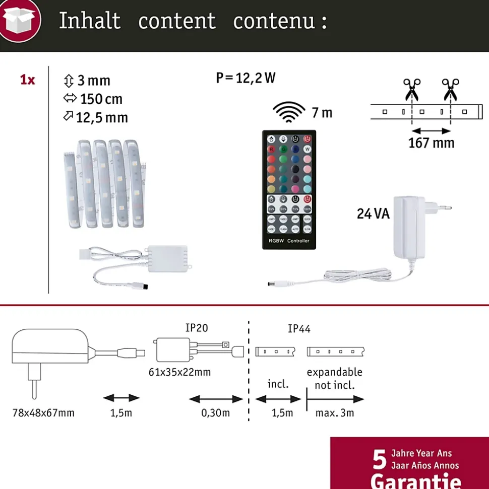 Kit complet avec ruban, alimentation et télécommande|Changement de couleur RGB|Peut être raccourci en fonction de la longueur souhaitée|Face arrière autocollante pour un montage simple|Matériel flexible pour le montage sur des surfaces planes ou courbes|La technologie LED fait économiser jusqu’à 80 % d’énergie par rapport aux ampoules à incandescence classiques.|Inclus le connecteur à 5 broches pour une connexion simple au ruban|Montage simple par système de connexion