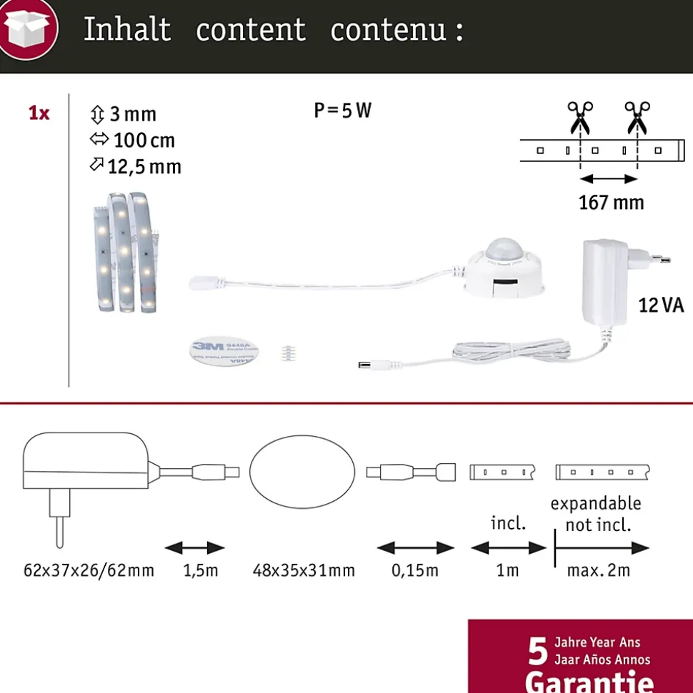 Température de couleur: 2700K – Blanc chaud|Face arrière autocollante pour un montage simple|Kit complet avec ruban et alimentation|Protection IP : IP44 – Protection contre les projections d’eau|Matériau flexible pour montage sur des surfaces planes ou à relief|Le capteur crépusculaire allume la lumière automatiquement au crépuscule.|Commutation automatique par détecteur de mouvement intégré|Montage simple par système de connexion