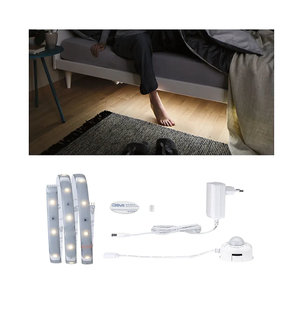 Avec le kit Comfort MaxLED Night pour lit simple, il est simple de s’orienter la nuit au sortir du lit. Simplement fixés sous les deux côtés du lit, le Strip autocollant et le Sensor offrent une durée d’éclairage de 30 secondes à 6 minutes que vous pouvez régler manuellement. Le Sensor s’active dès que règne l’obscurité pour éviter tout déclenchement inopiné la journée. Dès que le capteur détecte un mouvement, il déclenche l’éclairage et permet un déplacement assuré dans la pièce. Le Strip diffuse une lumière indirecte, non éblouissante.