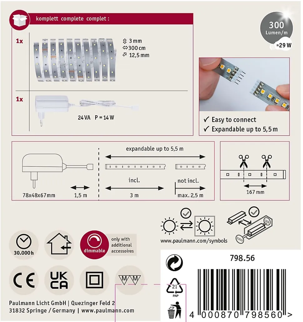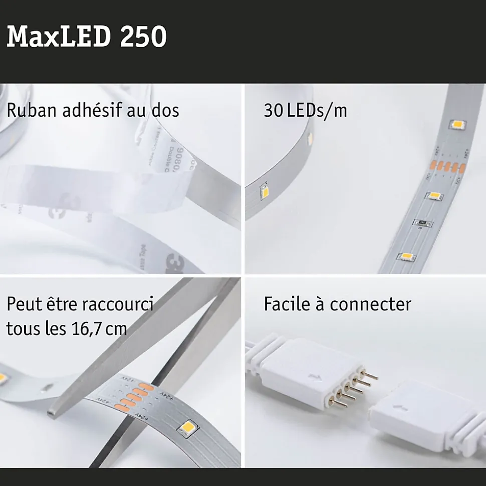 Le kit de base MaxLED 250 comprend en plus des Strips d’une longueur de 3 »5,5m, un ballast électronique adapté. Il est possible, au besoin, d’étendre le système à l’aide d’une unité de commande avec télécommande. Avec 12 watts, les Strips MaxLED 250 sont si puissants qu’ils peuvent être utilisés sans problème comme éclairage d’intérieur. Ils sont particulièrement impressionnants dans les profilés. Les strips blancs lumière du jour sont conçus pour les éclairages d’ambiance et fonctionnels stimulants et favorisant la concentration.