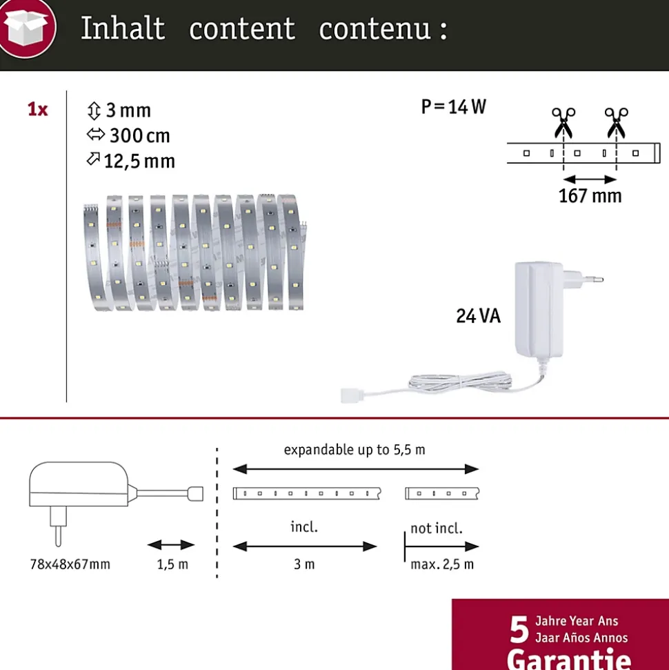 Kit complet avec ruban et alimentation|Peut être raccourci en fonction de la longueur souhaitée|Température de couleur: 6500K – Lumière du jour|Face arrière autocollante pour un montage simple|Matériel flexible pour le montage sur des surfaces planes ou courbes|La technologie LED fait économiser jusqu’à 80 % d’énergie par rapport aux ampoules à incandescence classiques.|Inclus le connecteur à 5 broches pour une connexion simple au ruban|Montage simple par système de connexion