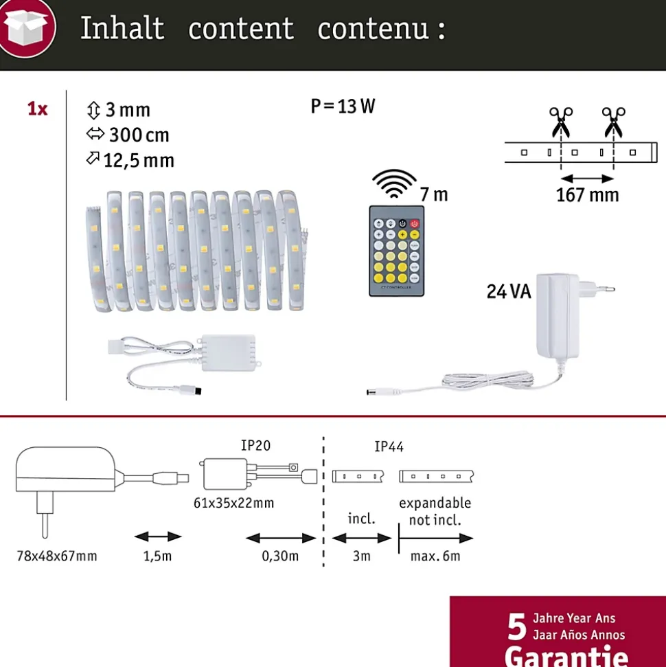 - Kit complet – bande LED 3 m, alimentation 24 V et unité de commande avec télécommande IR incluses.