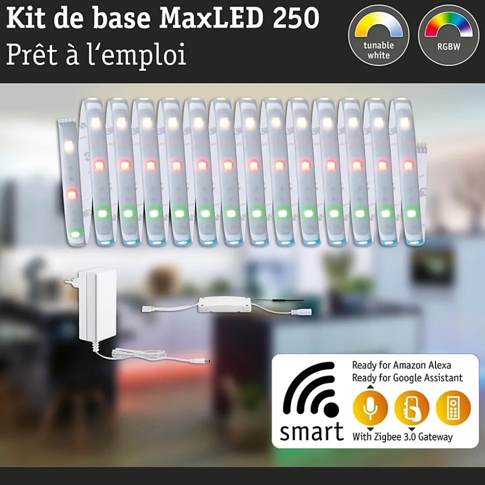 Les Strips MaxLED 250 d’une puissance de 22 watts produisent une lumière décorative agréable. Intégrant la fonction Zigbee 3.0, ils séduisent par leur fonctionnement intelligent. Grâce à la commande de couleur, vous pouvez créer une ambiance personnalisée, que ce soit un éclairage permanent unicolore ou des effets lumineux multicolores. Une diode blanche (W) assure de plus une confortable lumière blanc chaud et rend superflu le mélange d’un ton blanc avec les couleurs rouge, vert et bleu (RGB). Outre le ruban avec revêtement (Protect Cover) d’une longueur de 5 m, le kit de base contient un ballast adapté et un Controller Zigbee 3.0 qui permet une commande intelligente. Une télécommande ou une passerelle pour la commande intelligente ne sont pas comprises dans ce set de base. Zigbee 3.0 est un protocole de transmission radio qui met en réseau les appareils de différents fabricants. Le ballast contient une réserve de performance supplémentaire, ce qui permet le cas échéant de pouvoir le prolonger avec d’autres Strips. Les Strips MaxLED sont particulièrement impressionnants dans les profilés. Paulmann propose en outre une gamme fournie de profilés encastrés ou en saillie assortis aux Strips MaxLED.