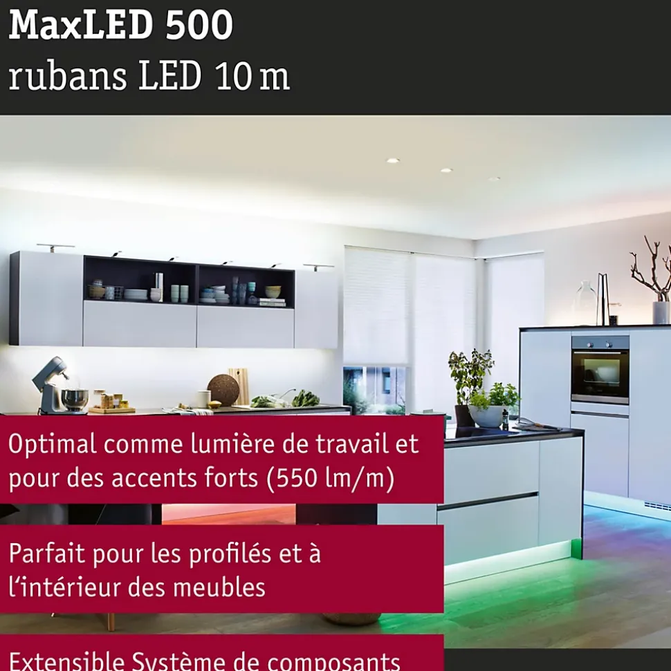Les strips MaxLED sont si puissants qu’ils peuvent être utilisés sans problème comme éclairage d’intérieur. Grâce à leur commande de couleur, vous pouvez créer une ambiance personnalisée, qu’il s’agisse d’un éclairage permanent monochrome ou d’effets lumineux multicolores. Une diode blanche (W) assure de plus une confortable lumière blanc chaud et rend superflu le mélange d’un ton blanc avec les couleurs rouge, vert et bleu (RGB). En raison de sa longueur de 10m, ce strip est optimal pour la mise en valeur du mobilier ou pour des projets plus importants. Il est tout à fait possible de relier plusieurs strips entre eux à l’aide des trois câbles adaptateurs fournis.