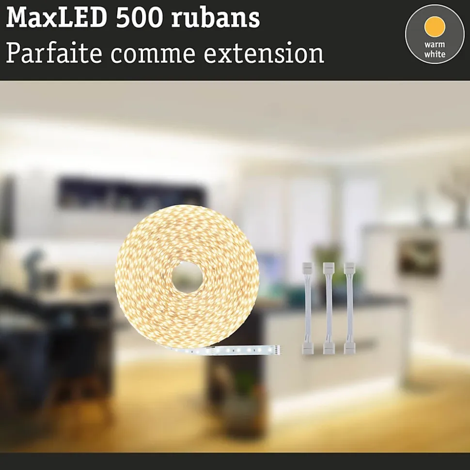 Les strips MaxLED sont si puissants qu’ils peuvent être utilisés sans problème comme éclairage d’intérieur. Ils sont particulièrement impressionnants dans les profilés. Les strips blanc chaud délivrent un éclairage d’ambiance et fonctionnel agréable et relaxant. En raison de sa longueur de 20m, ce strip est optimal pour la mise en valeur du mobilier ou pour des projets plus importants. Il est tout à fait possible de relier plusieurs strips entre eux à l’aide des trois câbles adaptateurs fournis.