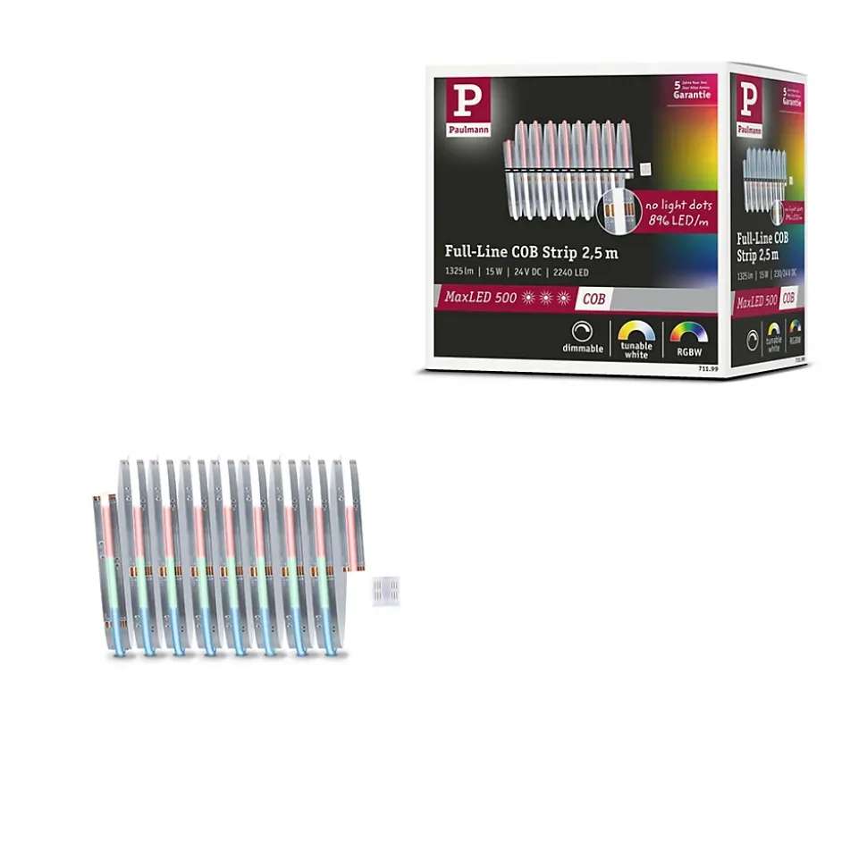 Ce MaxLED 500 full-line COB Stripe crée un éclairage impressionnant. Le rubans LED d’une longueur de 2,5m peut être étendu selon les besoins avec des strips LED supplémentaires, des connecteurs et des unités de commande avec télécommande. La longueur maximale varie en fonction du transformateur choisi et doit être prise en compte lors de la planification. La technologie RGBW permet de choisir entre des teintes fluides et d’utiliser en plus la fonction Tunable White. C’est ainsi que l’on crée l’atmosphère adéquate, qu’il s’agisse d’un blanc chaud relaxant ou de couleurs vives.