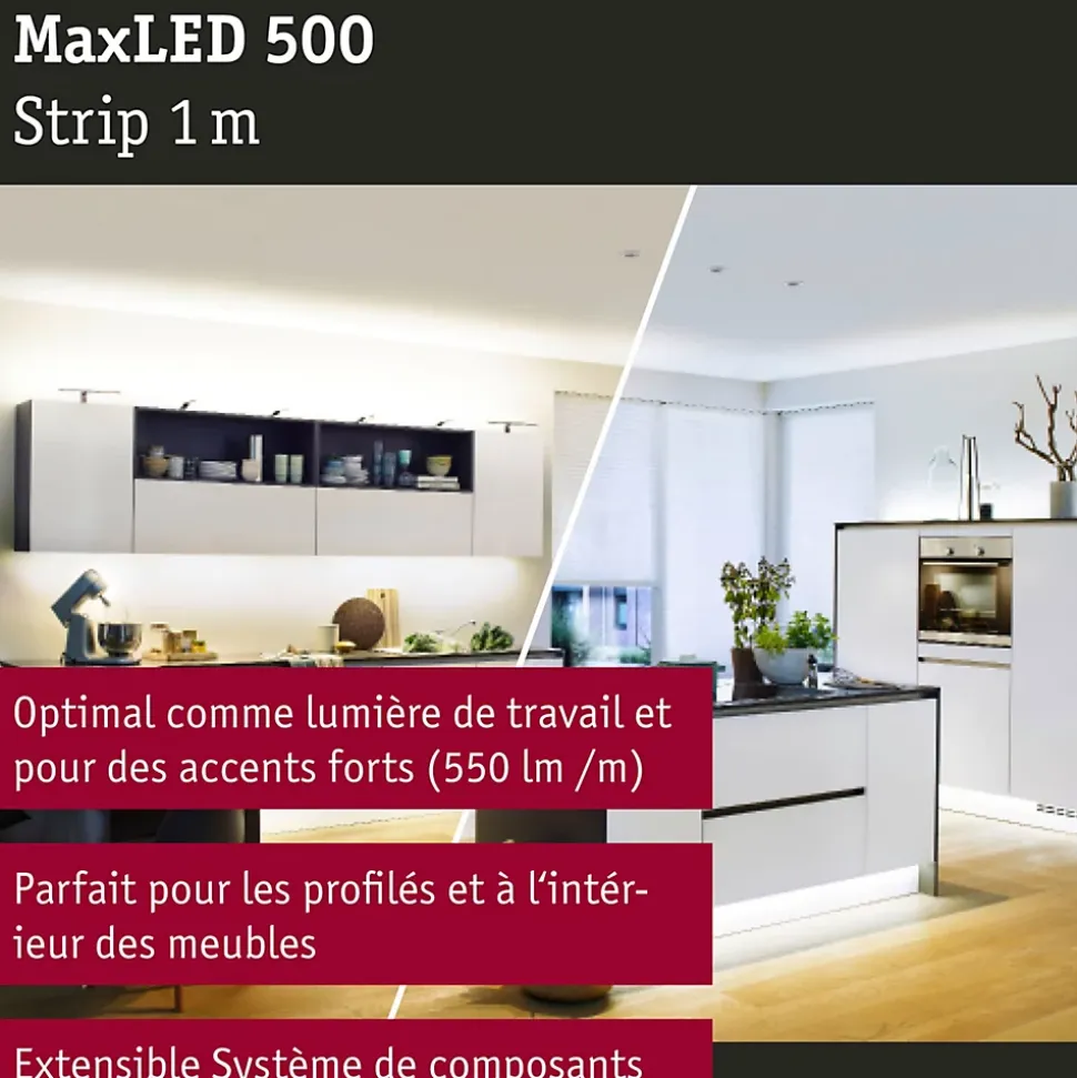 Les strips MaxLED sont si puissants qu’ils peuvent être utilisés sans problème comme éclairage d’intérieur. Ils sont particulièrement impressionnants dans les profilés. Grâce à la commande de la lumière blanche intelligente Tunable White, vous personnalisez la température de couleur des strips, du blanc lumière du jour de l’éclairage de travail au blanc chaud de la lumière de relaxation. Les strips individuels permettent d’étendre votre kit de base SmartHome. Veuillez prendre en compte à la conception la longueur maximale indiquée sur votre kit de base. Celle-ci ne peut pas être dépassée.