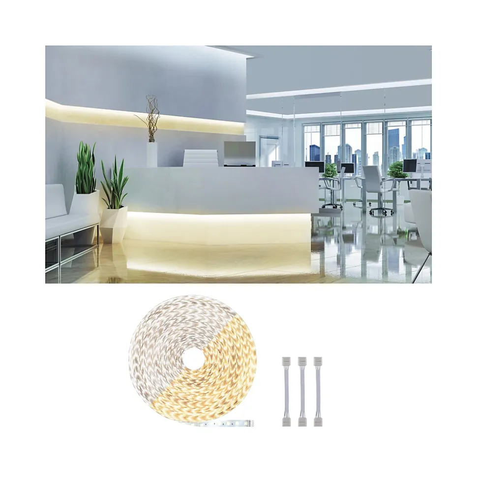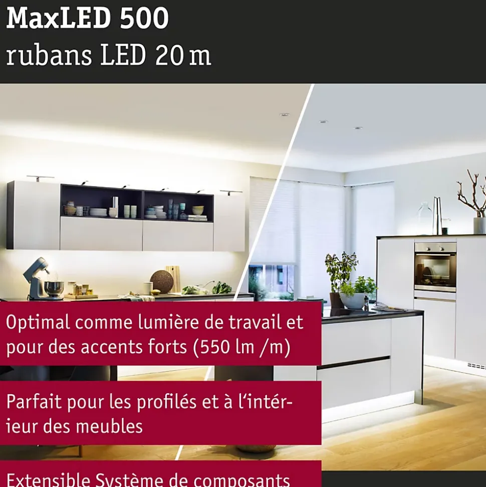 Les strips MaxLED sont si puissants qu’ils peuvent être utilisés sans problème comme éclairage d’intérieur. Grâce à la commande de la lumière blanche intelligente Tunable White, vous pouvez personnaliser la température de couleur du strip d’un blanc lumière du jour en guise d’éclairage de travail à un blanc chaud plus propice à la relaxation. En raison de sa longueur de 20m, ce strip est optimal pour la mise en valeur du mobilier ou pour des projets plus importants. Il est tout à fait possible de relier plusieurs strips entre eux à l’aide des trois câbles adaptateurs fournis.
