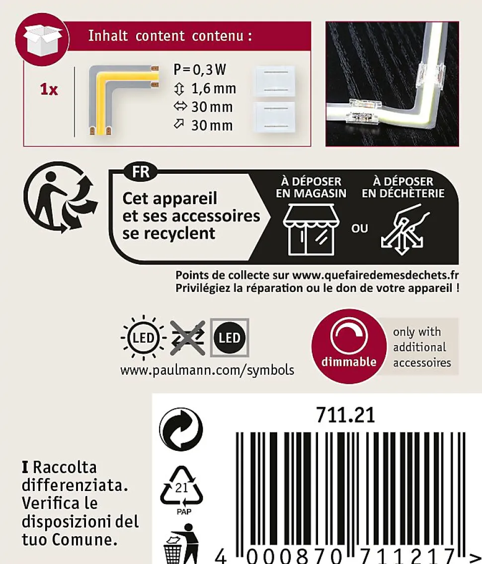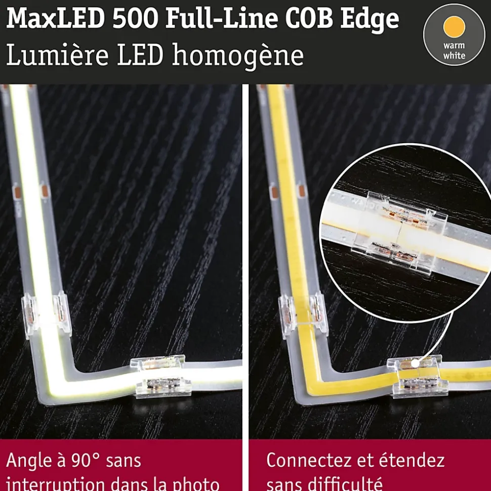 Les angles MaxLED 500 Edge Full-Line COB sont le complément parfait d’un concept d’éclairage MaxLED 500 Full-Line COB requérant une pose coudée. Les angles COB des strips blanc chaud permettent de les déplacer à 90° sans interrompre leur halo lumineux. Chaque angle est livré avec deux connecteurs lumineux pour le raccordement. L’angle peut être raccordé de manière universelle dans les deux sens, à gauche ou à droite. Que ce soit pour le plan de travail dans la cuisine ou pour d’autres surfaces de travail, les Strips MaxLED 500 Full-Line COB conviennent à merveille comme éclairage de travail non éblouissant.