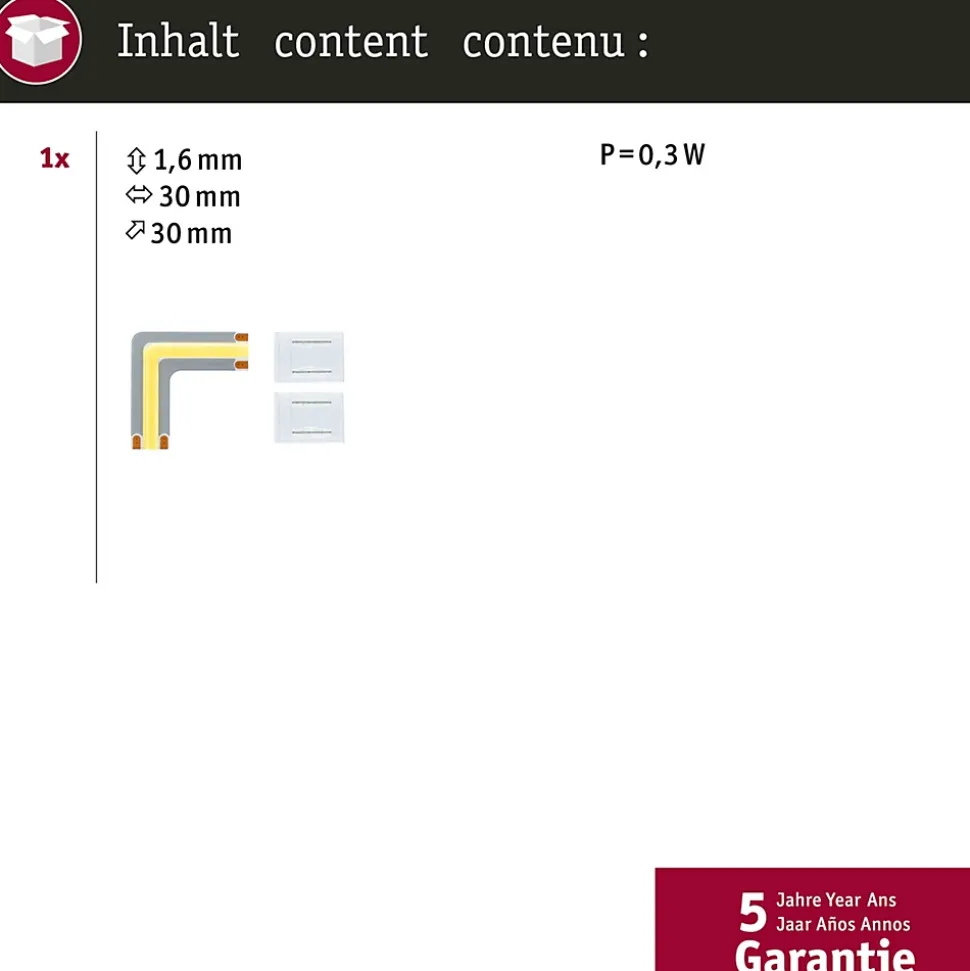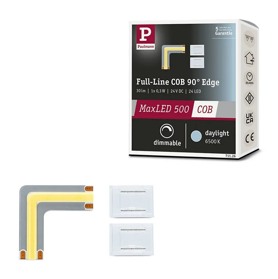 Les angles MaxLED 500 Edge Full-Line COB sont le complément parfait d’un concept d’éclairage MaxLED 500 Full-Line COB requérant une pose coudée. Les angles COB des strips blanc lumière du jour permettent de les déplacer à 90° sans interrompre leur halo lumineux. Chaque angle est livré avec deux connecteurs lumineux pour le raccordement. L’angle peut être raccordé de manière universelle dans les deux sens, à gauche ou à droite. Plan de travail de cuisine, atelier ou autres surfaces, les strips MaxLED 500 Full-Line COB sont si puissants qu’ils peuvent être utilisés sans problème comme éclairage d’intérieur.