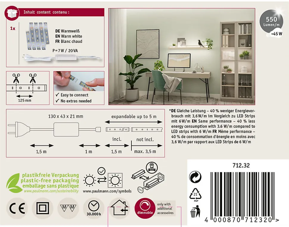 MaxLED 500 Strip LED Kit de base 1,5m blanc chaud 5,5W 550lm/m 2700K 20VA
