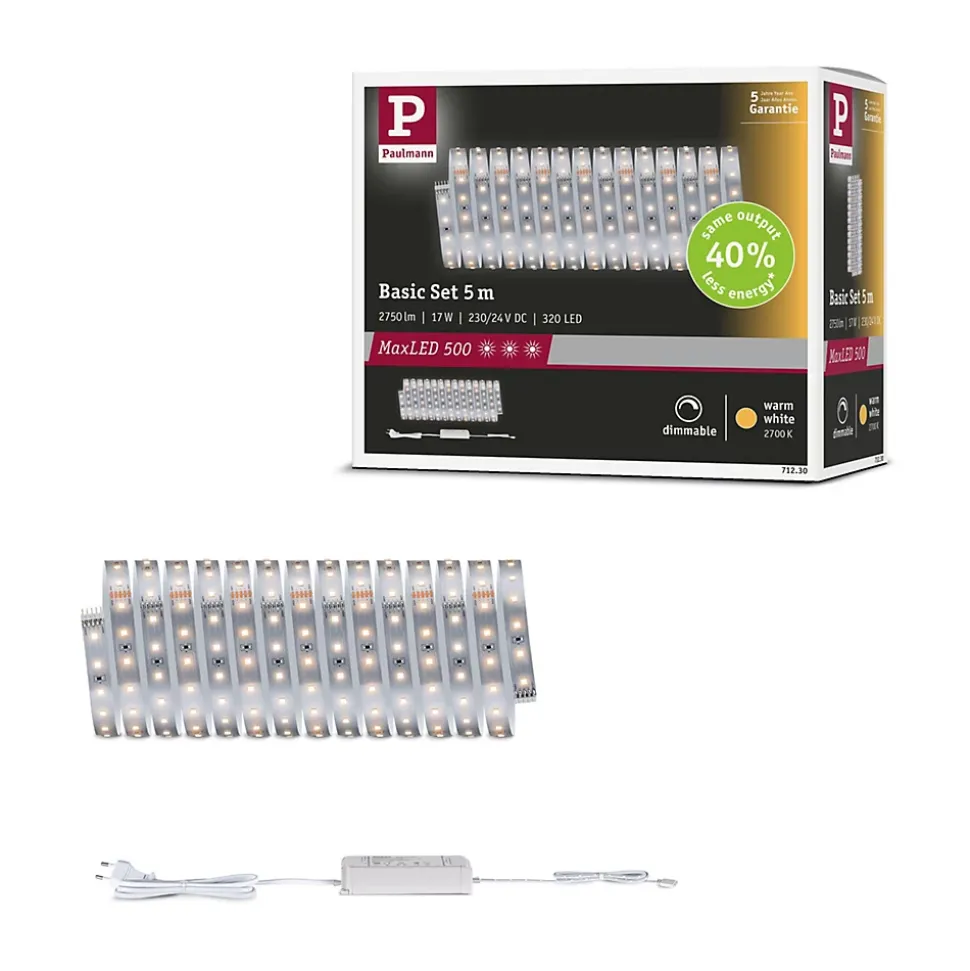 Kit complet avec Strip et alimentation|Strip LED à haute efficacité 40 % d’énergie en moins pour le même rendement lumineux|Température de couleur: 2700K – Blanc chaud|Peut être raccourci en fonction de la longueur souhaitée|Face arrière autocollante pour un montage simple|Gradable avec le contrôleur variateur/commutateur MaxLED|Aménagements personnalisés|Montage simple par système de connexion