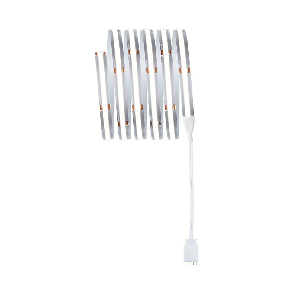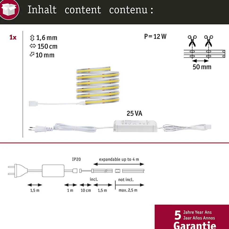 Que ce soit pour le plan de travail dans la cuisine ou pour d’autres surfaces de travail, les Strips MaxLED 500 Full-Line COB conviennent à merveille comme éclairage de travail non éblouissant. Le kit de base MaxLED 500 COB avec ses 10 W, ses 1,5 m de long et ses 480 LED/m produit un rayonnement absolument homogène sans points lumineux visibles. Le connecteur lumineux permet une connexion parfaite qui prolonge le visuel lumineux linéaire sans interruption visible. Le Strip de 10 mm est particulièrement étroit et se glisse donc facilement dans les profilés LED filigranes. L’angle de rayonnement large de 180° répartit la lumière à merveille sans ombre portée. Une gaine continue protège les LED de la poussière et de l’humidité, les points de contact ont l’IP20. La prolongation du kit de base blanc lumière du jour est facile à l’aide d’un strip individuel adapté.