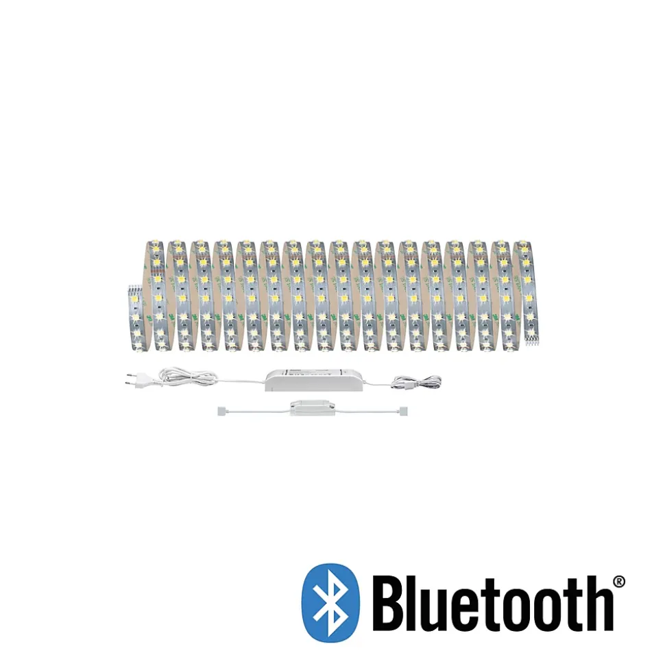 Avec 47W et 550lm/m, les MaxLED-Strips 500 sont si puissants qu’ils peuvent être utilisés sans problème pour éclairer une pièce. En particulier dans les profilés, ils sont de véritables points forts. Grâce à la commande intelligente de lumière blanche Tunable White, la couleur de la lumière des bandes peut être variée individuellement – de la lumière de travail blanche comme la lumière du jour à l’éclairage de détente blanc chaud, tout est possible. En plus de la bande d’une longueur de 10m, le kit comprend un ballast adapté ainsi que le contrôleur de variation/commutation MaxLED de la série Smart Home. Celui-ci permet d’allumer et de faire varier l’intensité de la bandelette. Le contrôleur est piloté via Bluetooth – la commande s’effectue confortablement via la télécommande Paulmann Boss.