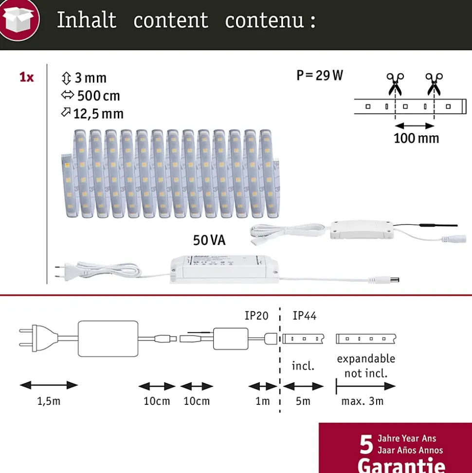 Avec 26 watts, les Strips MaxLED 500 sont si puissants qu’ils peuvent être utilisés sans problème comme éclairage d’intérieur. Intégrant la fonction Zigbee 3.0, ils séduisent par leur fonctionnement intelligent. Grâce à la commande de la lumière blanche intelligente Tunable White, vous pouvez personnaliser la température de couleur du strip d’un blanc lumière du jour en guise d’éclairage de travail à un blanc chaud plus propice à la relaxation. Outre le ruban avec revêtement (Protect Cover) d’une longueur de 5 m, le kit de base contient un ballast adapté et un Controller Zigbee 3.0 qui permet une commande intelligente. Une télécommande ou une passerelle pour la commande intelligente ne sont pas comprises dans ce set de base. Zigbee 3.0 est un protocole de transmission radio qui met en réseau les appareils de différents fabricants. Le ballast contient une réserve de performance supplémentaire, ce qui permet le cas échéant de pouvoir le prolonger avec d’autres Strips. Les Strips MaxLED sont particulièrement impressionnants dans les profilés. Paulmann propose en outre une gamme fournie de profilés encastrés ou en saillie assortis aux Strips MaxLED.