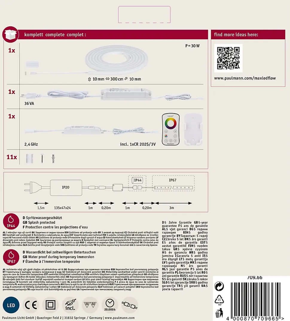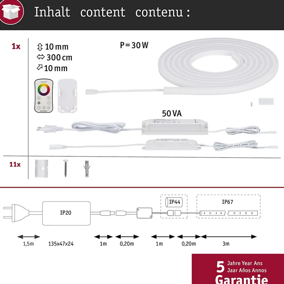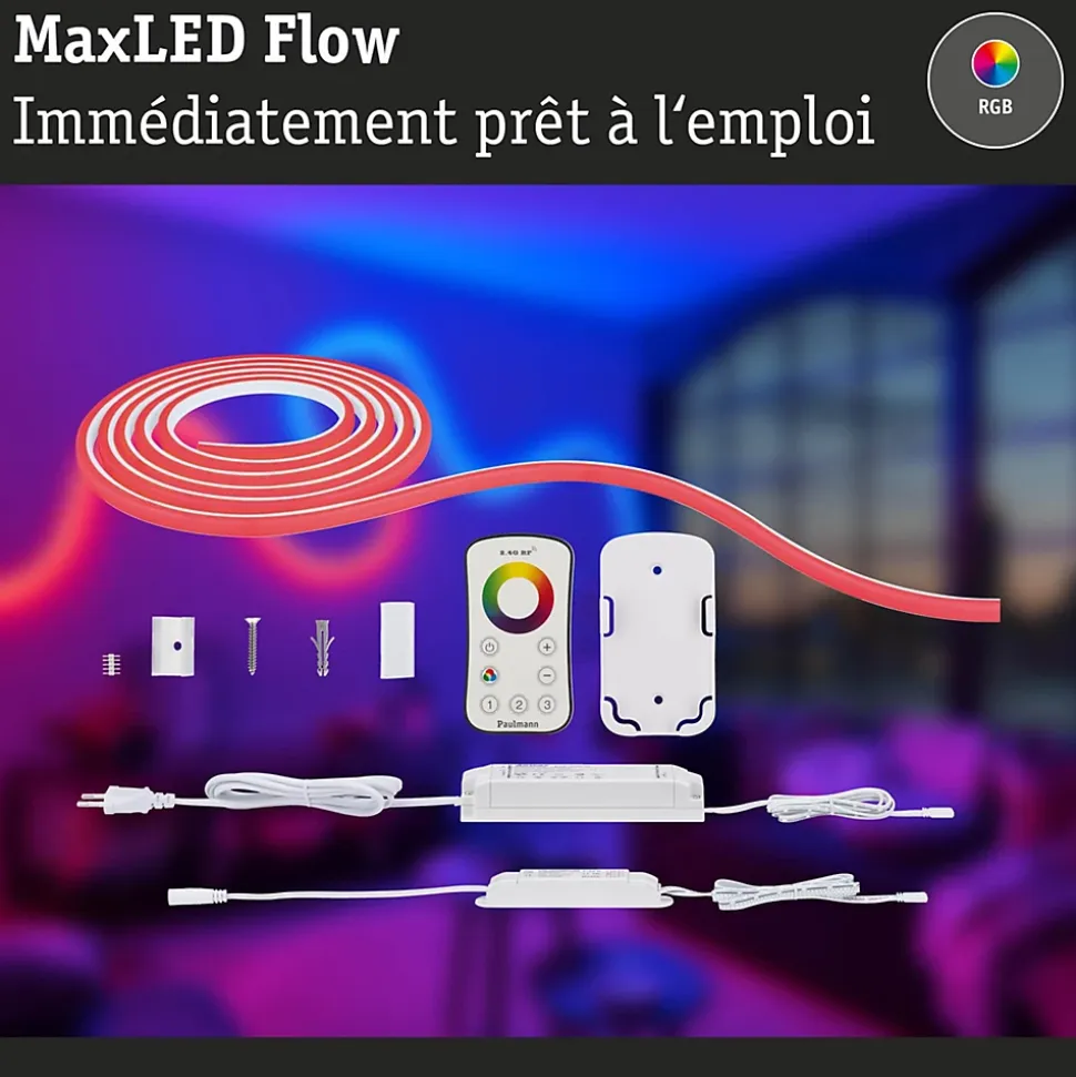 Subtil, homogène et puissant ! Avec sa puissance de 27 watts, MaxLED Flow RGB diffuse une lumière étendue sans points LED visibles. Il est enrobé d’un profilé flexible, possède un angle de rayonnement spectaculaire et peut être posé de manière rectiligne ou en épousant des courbes. Le set comprend des clips de montage transparents quasi invisibles, ainsi que des vis et des douilles de fixation. Doté de la protection IP67, ce Strip filigrane convient aux pièces humides et vient illuminer votre salle de bain Wellness.