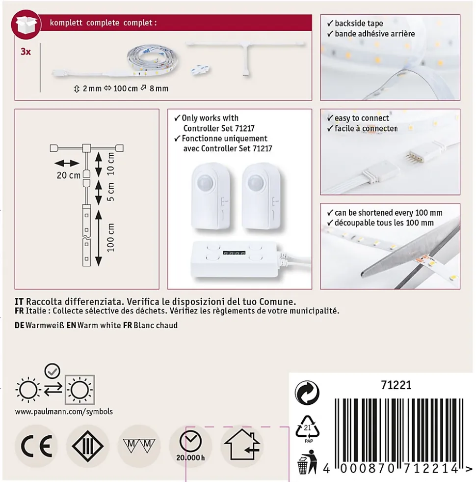 Ce kit d’extension MaxLED Stairs forme, en combinaison avec le kit d’installation, un système global pour un éclairage élégant des escaliers. Pour un niveau de sécurité élevé, les détecteurs de mouvement avec fonction sans fil allument et éteignent automatiquement la lumière afin d’éviter de trébucher dans l’obscurité. Le kit comprend 3 rubans LED de 100 cm de longueur ainsi qu’un distributeur (répartiteur en T) pour le câblage le long de l’escalier. Les strips LED peuvent être installés sous les marches. Le système peut être étendu de manière flexible de 1 à 18 marches. Pour un effet lumineux impressionnant, la fonction « LightWave » peut être activée. Le système est compatible avec les MaxLED Connectoren, ce qui permet d’utiliser les connecteurs MaxLED (p. ex. 70575) par Plug & Play.