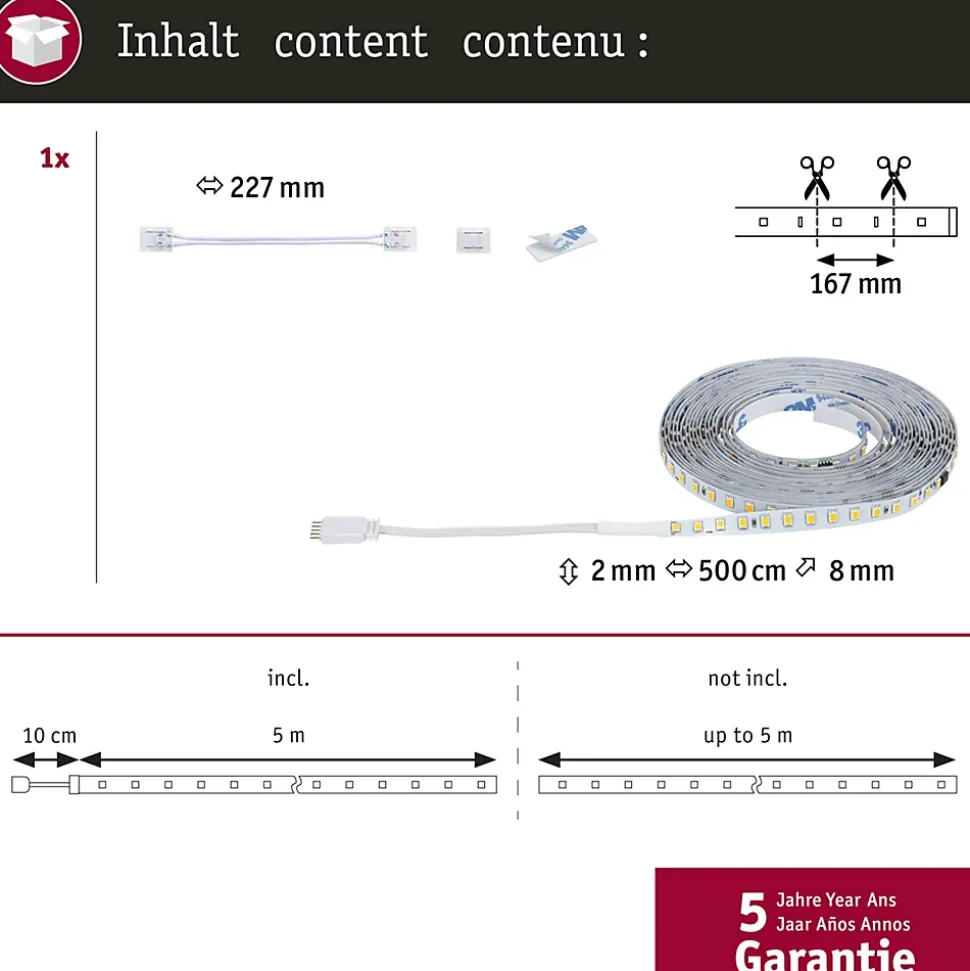 Contenu de la livraison : 1 ruban latéral MaxLED Stair de 5 m, 1 connecteur pour raccourcir le ruban à 4 m par exemple|Extension pour le kit d’installation MaxLED Stair|Compatible avec les connecteurs MaxLED|La luminosité du ruban LED est dimmable|Température de couleur: 2700K – Blanc chaud