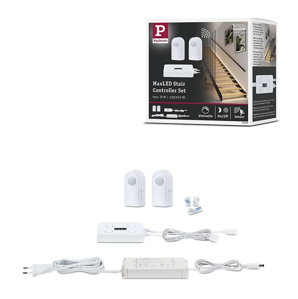 Kit d’installation comprenant un transformateur, un controleur et deux détecteurs de mouvement sans fil|Kit d’installation servant de base aux kits d’extension MaxLED Stair|Aucun câblage supplémentaire des détecteurs de mouvement grâce à la fonction sans fil|Sécurité élevée grâce à l’allumage et l’éteignage automatiques par détecteur de mouvement|System complet : extensible de 1 à 18 marches|Compatible avec les connecteurs MaxLED|Effet lumineux remarquable grâce à la fonction « LightWave »