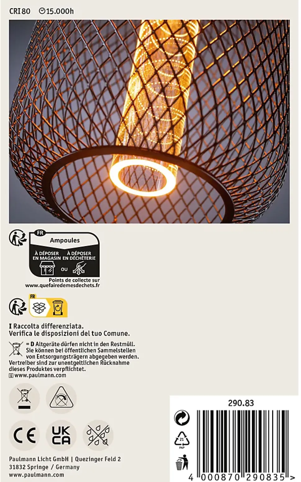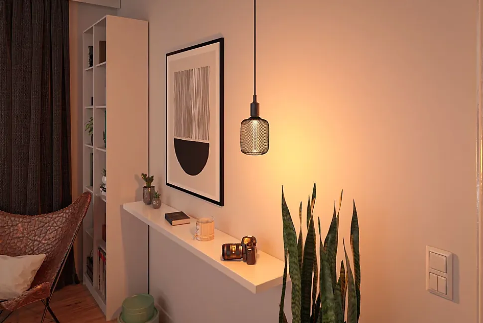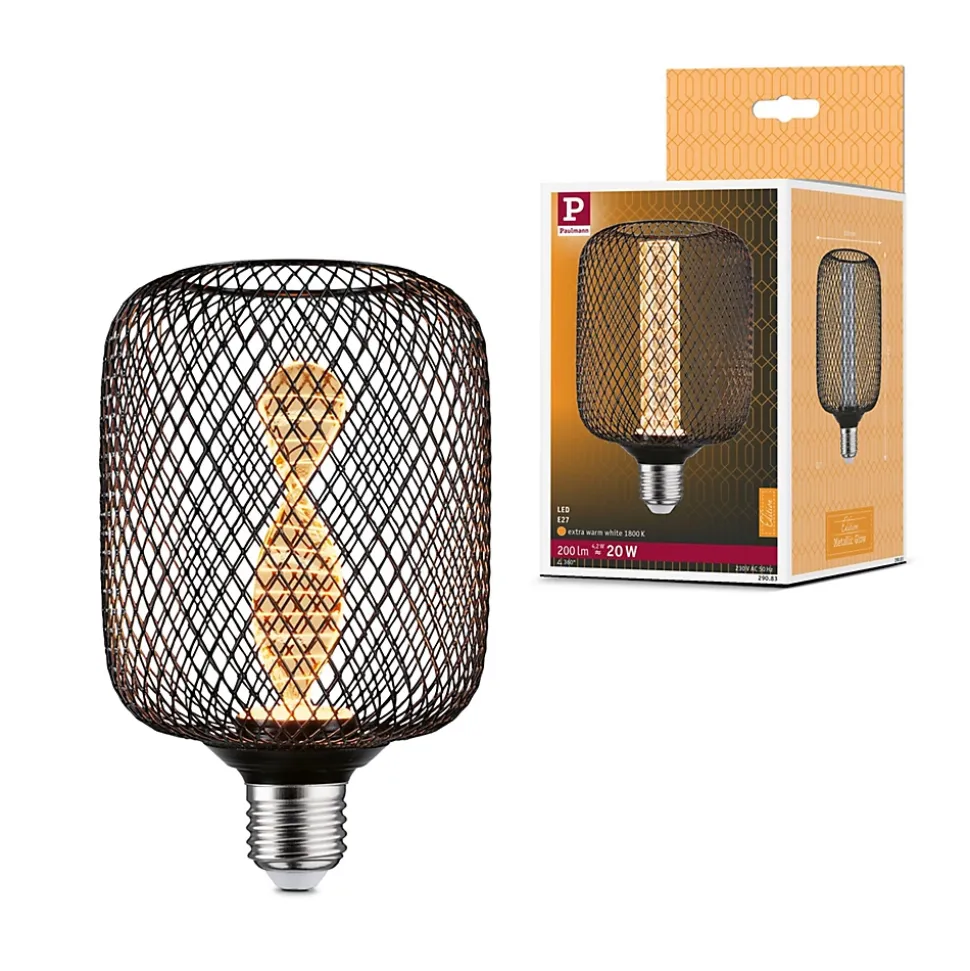 L’ampoule LED Metallic Glow associe une lumière dorée discrète à une coupelle métallique noire décorative. Grâce à la combinaison d’un cylindre intérieur gravé au laser et d’une fine structure grillagée, ces ampoules conviennent parfaitement aux suspensions ou aux lampes à poser avec douille E27. L’élément lumineux situé à l’extrémité du cylindre intérieur diffuse une lumière parfaitement dirigée vers le bas. Le design intemporel rencontre ici la technologie LED efficace et assure un éclairage d’ambiance confortable et doré.