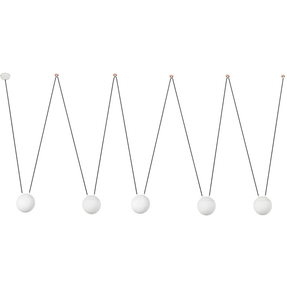 Suspension blanche à cinq lumières conçue par Nahtrang avec structure en métal et diffuseur en verre opale. La matière et la lumière traversant le diffuseur créent une atmosphère chaleureuse. Cette suspension design est adaptable et personnalisable, grâce à l’accessoire crochet vous pourrez positionner la lumière là où vous en avez besoin. Grâce à ses possibilités, il est idéal pour l’éclairage de restaurants ou de projets commerciaux en général, ainsi que pour des projets résidentiels