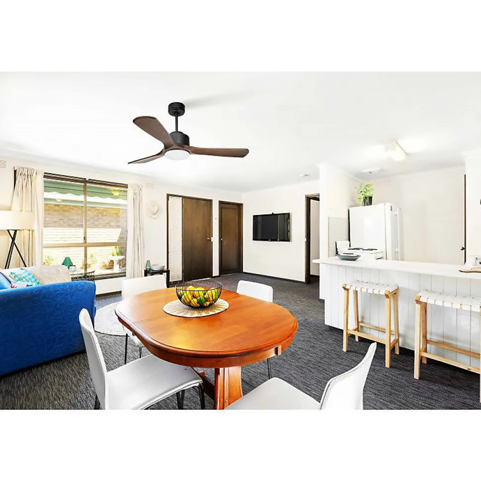 Modulo RegularModulo_Kl_DC1_P6DW132_L1Le Modulo est un ventilateur de plafond modulable et un destratificateur d’air, idéal pour ventiler en été et homogénéiser la chaleur en hiver. Ce régulateur thermique est un véritable atout pour réduire vos dépenses énergétiques en chauffage et climatisation.Technologie et PerformanceÉquipé d’un moteur à courant continu DC avec roulements à billes auto-lubrifiés, le Modulo assure un contrôle précis de la vitesse, une efficacité énergétique optimale, un fonctionnement silencieux, un entretien minimal et une longévité accrue. Le moteur DC garantit une faible consommation d’énergie et un fonctionnement Hyper Silence, pratiquement inaudible jusqu’à la vitesse 3.Design et FlexibilitéLe Modulo est livré avec deux tiges de plafond de 12,5 cm et 25 cm, avec des options de prolongateurs de 60, 120 et 180 cm. Les pales, disponibles en ABS léger et résistant ou en bois, peuvent être configurées en 2 ou 3 pales selon vos préférences. Ce modèle inclut un kit lumineux adaptable, idéal pour des pièces de 25 à 40 m² en été et 60 à 90 m² en hiver.Fonctionnalités AvancéesChaque ventilateur Modulo est fourni avec une télécommande et un récepteur FullFlow, offrant un accès complet aux fonctionnalités : sélection des vitesses, contrôle de l’éclairage, minuterie, thermostat, Wi-Fi et inversion du sens de rotation des pales. Le thermostat ajuste automatiquement la vitesse en fonction de la température ambiante, de 0-19°C à la vitesse 1 jusqu’à plus de 28°C à la vitesse 6. Cette fonction peut ê