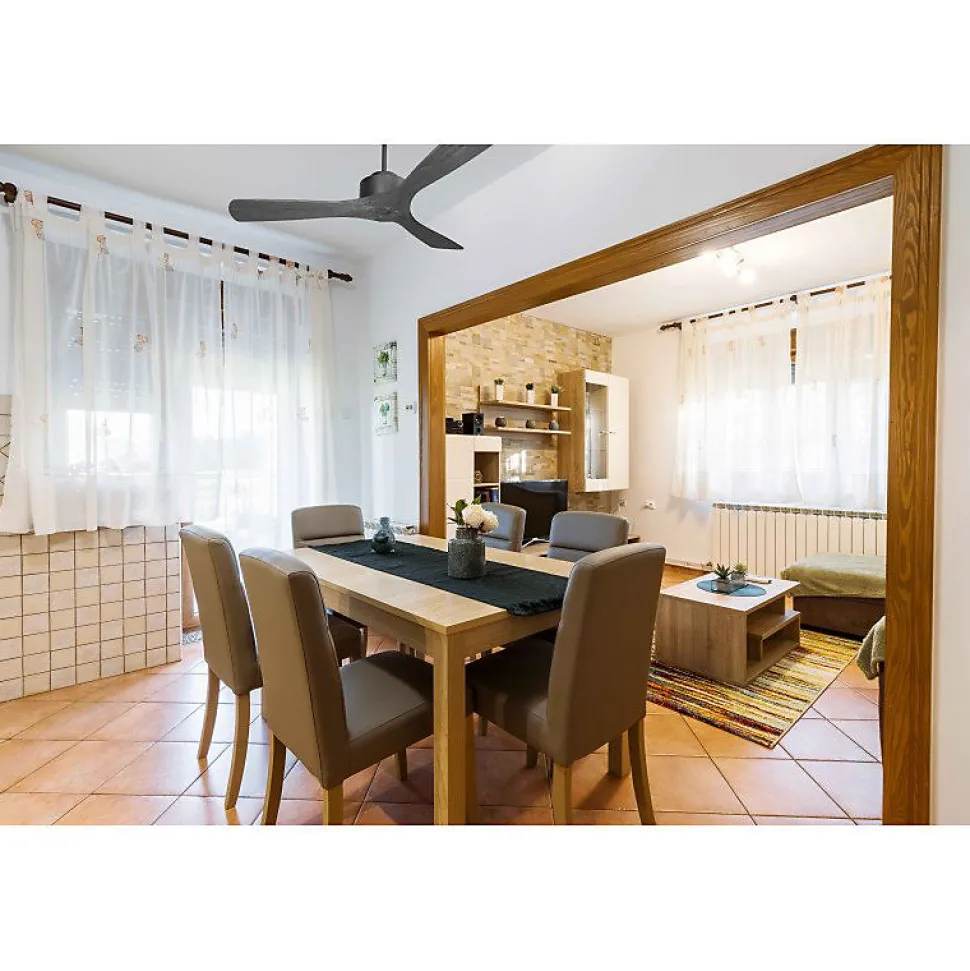 Modulo Regular RingModulo_DC1_P6Bk132_RingBkLe Modulo est un ventilateur de plafond modulable et un destratificateur d’air, idéal pour ventiler en été et équilibrer la chaleur en hiver. Ce régulateur thermique vous aide à réduire vos dépenses en chauffage et climatisation.Performance et SilenceÉquipé d’un moteur à courant continu DC avec roulements à billes auto-lubrifiés, le Modulo assure un contrôle précis de la vitesse, une efficacité énergétique, un fonctionnement silencieux, un faible entretien et une longue durée de vie. Les ventilateurs Modulo sont Hyper Silence, pratiquement inaudibles jusqu’à la vitesse 3, parfaits pour les espaces sensibles au bruit comme les salons, bureaux ou chambres.Installation et OptionsLe Modulo est livré avec deux tiges de plafond de 12,5 cm et 25 cm, avec des options de tiges de 60, 120 et 180 cm disponibles. Les pales, en ABS léger et résistant ou en bois, peuvent être montées par 2 ou 3 selon vos préférences.Caractéristiques TechniquesLe ventilateur est conçu pour des pièces de 25 à 40 m² en mode été et 60 à 90 m² en mode hiver. Avec un diamètre de 132 cm, il offre une puissance de 3450-12480 m³/h, une vitesse de rotation de 70-210 RPM, un niveau sonore de 28-45 dB et une consommation de 3-13 Watts.Fonctionnalités AvancéesChaque ventilateur Modulo est livré avec une télécommande et un récepteur FullFlow, permettant de contrôler les vitesses, l’éclairage, la minuterie, le thermostat, le Wi-Fi et le sens de rotation des pales. Le thermostat ajuste auto