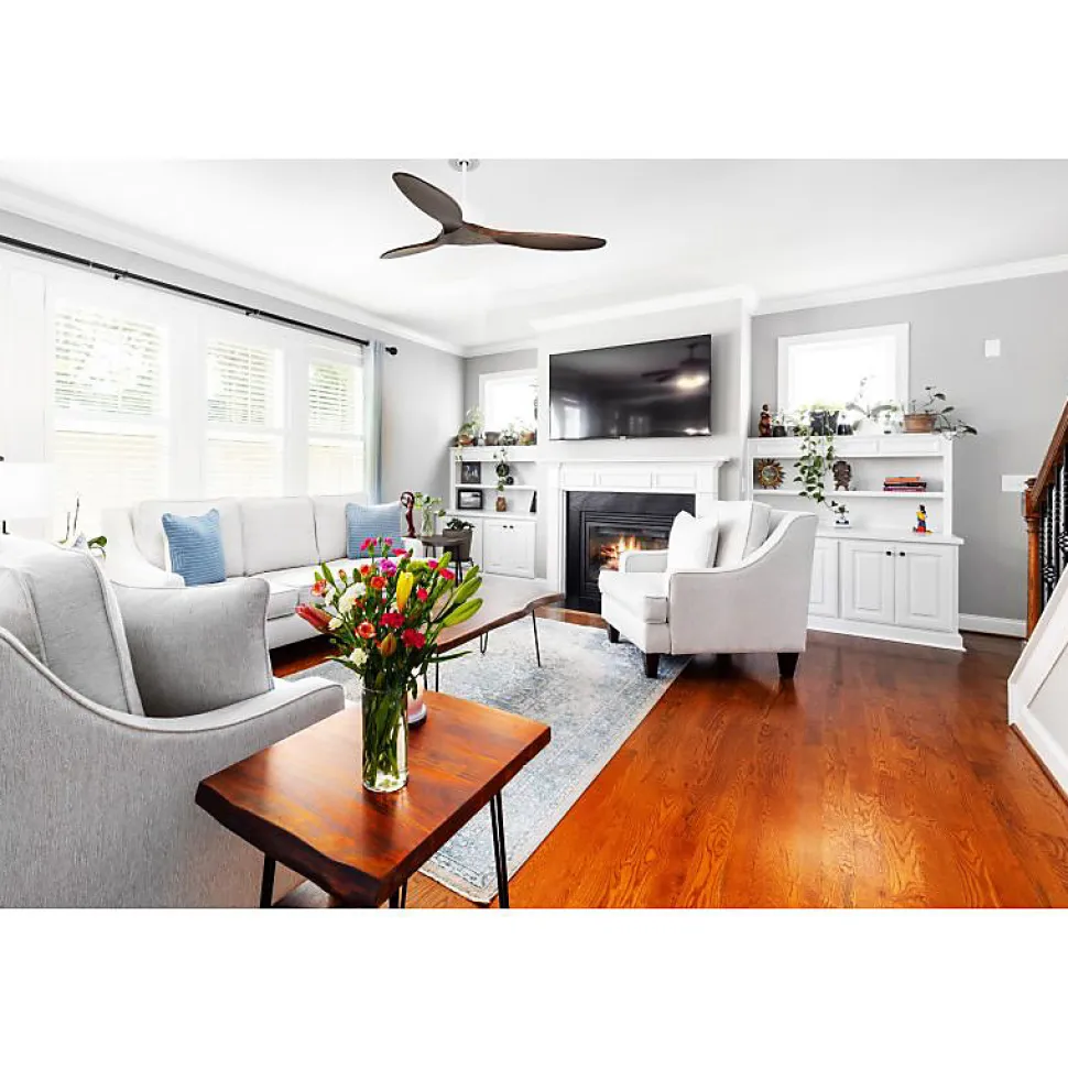 Modulo garantie 10 ans.Modulo Slim DC4_P5ClsdDw132Le Modulo Slim, version affinée du Modulo Regular, conserve les mêmes performances techniques avec un design plus discret. Ce ventilateur de plafond sert également de déstratificateur d’air, intégrant un moteur DC (courant continu) pour une efficacité énergétique et un silence exceptionnel.Caractéristiques du MoteurLe moteur DC du Modulo Slim assure un contrôle précis de la vitesse, un fonctionnement silencieux et une longue durée de vie. Il est pratiquement inaudible jusqu’à la vitesse 3, et même aux vitesses supérieures, seul le mouvement de l’air peut être perçu. Idéal pour les espaces sensibles au bruit comme les salons, bureaux ou chambres.Options de Montage et PalesLe Modulo Slim est livré avec deux tiges de plafond de 12,5 cm et 25 cm, avec des options supplémentaires de 60, 120 et 180 cm. Les pales, disponibles en ABS ou bois, peuvent être montées en configurations de 2 ou 3 pales selon vos préférences. Le modèle actuel inclut des pales fermées (P5 – closed blades), adaptées pour des pièces de 25 à 40 m² en été et 60 à 90 m² en hiver.Spécifications Techniques Taille : 132 cm Matériau : Bois Puissance : 3450-12480 m³/h Vitesse : 70-210 RPM Niveau sonore : 28-45 dB Consommation : 3-21 WattsFonctionnalités AvancéesChaque ventilateur Modulo est équipé d’une télécommande et d’un récepteur FullFlow, offrant un accès complet aux fon