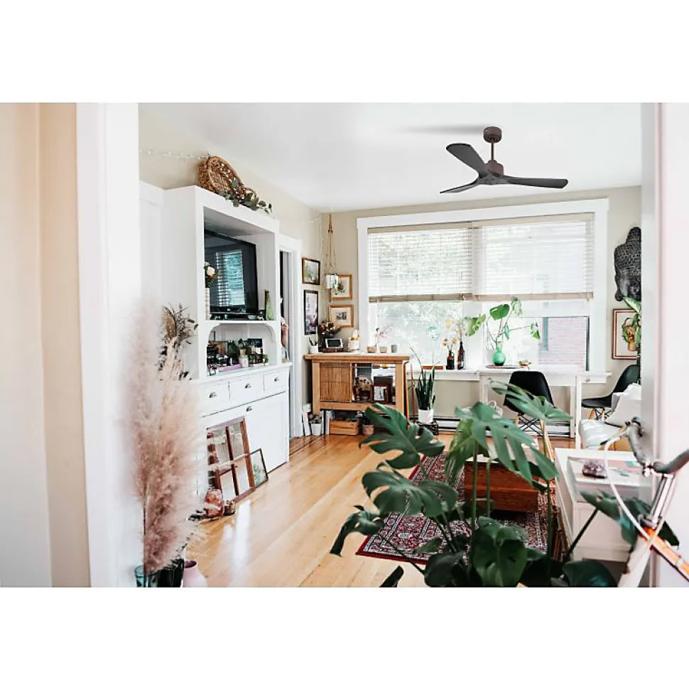 Modulo garantie 10 ans.Modulo Slim DC6_P6ClsdBk132Le Modulo Slim est la version plus fine et discrète du Modulo Regular, tout en conservant les mêmes performances techniques et un moteur identique. Ce ventilateur de plafond sert également de déstratificateur d’air, offrant une ventilation efficace et ultra silencieuse grâce à son moteur DC (courant continu).CaractéristiquesLe moteur DC du Modulo Slim assure un contrôle précis de la vitesse, un fonctionnement silencieux, une longue durée de vie et une efficacité énergétique remarquable. Ce ventilateur est particulièrement adapté aux espaces sensibles au bruit comme les salons, bureaux ou chambres, étant pratiquement inaudible jusqu’à la vitesse 3.Le Modulo Slim est livré avec deux tiges de plafond de 12,5 cm et 25 cm, avec des options supplémentaires de tiges de 60, 120 et 180 cm. Les pales, disponibles en ABS léger et résistant ou en bois, peuvent être montées en configurations de 2 ou 3 pales selon les préférences.La version actuelle inclut des pales fermées (P6 – closed blades) adaptées pour des pièces de 25 à 40 m² en été et 60 à 90 m² en hiver. Avec un diamètre de 132 cm, le ventilateur offre une puissance de 3850-12990 m³/h, une vitesse de rotation de 70-210 RPM, un niveau sonore de 28-45 dB et une consommation de 3-21 Watts.Fonctionnalités avancéesChaque ventilateur de la série Modulo est équipé d’une télécommande et d’un récepteur FullFlow, permettant de contrôler les vitesses, l’allumage/extinction, la minuterie, le thermostat, le Wi-Fi et le sens de rotation des pales. Le thermostat ajuste automatiquement la vitesse en fonction de la température ambiante, avec des réglages a