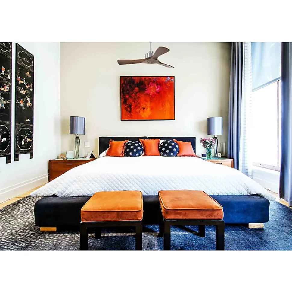 Modulo garantie 10 ans.Modulo Slim DC3_P6ClsdDw106Découvrez le Modulo Slim, le ventilateur de plafond élégant et discret, conçu pour offrir une performance exceptionnelle tout en s’intégrant harmonieusement à votre intérieur. Bien que son design soit plus fin que celui du Modulo Regular, il conserve les mêmes caractéristiques techniques avancées, notamment un moteur DC ultra-efficace et silencieux.CaractéristiquesLe Modulo Slim n’est pas seulement un ventilateur de plafond, c’est aussi un déstratificateur d’air, optimisant le confort thermique de votre espace. Grâce à son moteur DC, il assure un contrôle précis de la vitesse, un fonctionnement silencieux, une longue durée de vie et une efficacité énergétique remarquable. Il est presque inaudible jusqu’à la vitesse 3, ce qui le rend idéal pour les environnements sensibles au bruit comme les salons, bureaux ou chambres.Design et InstallationLe Modulo Slim est livré avec deux tiges de plafond de 12,5 cm et 25 cm, avec des options supplémentaires de 60, 120 et 180 cm pour s’adapter à différents besoins d’installation. Les pales, disponibles en ABS résistant ou en bois, peuvent être configurées en 2 ou 3 unités selon vos préférences. Le modèle P6 avec pales fermées est idéal pour des pièces de 15 à 20 m² en été et 40 à 60 m² en hiver.Performance et EfficacitéAvec un diamètre de 106 cm, le Modulo Slim offre une puissance de ventilation de 2450 à 7240 m³/h, avec une consommation énergétique de seulement 3 à 13 watts. Son niveau sonore varie de 28 à 45 dB, garantissant un fonctionnement discret. La télécommande incluse permet de contrôler toutes les fonctions, y compris la sélection des vi