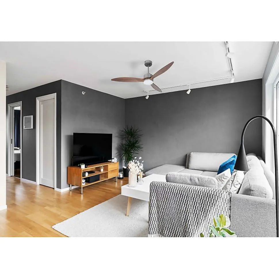 Modulo SlimDC3S_P8Dw132_L1sLe Modulo Slim est un ventilateur de plafond modulable et un destratificateur d’air, idéal pour une ventilation efficace en été et une récupération de chaleur en hiver. Ce modèle polyvalent se distingue par son design moderne et ses fonctionnalités avancées, offrant une régulation thermique qui optimise votre consommation énergétique, réduisant ainsi vos coûts de chauffage et de climatisation.Technologie Silencieuse et ÉconomiqueÉquipé d’un moteur à courant continu (DC) entièrement en cuivre avec des roulements à billes auto-lubrifiés, le Modulo Slim garantit un fonctionnement silencieux et sans souci. Ce moteur DC permet un contrôle précis de la vitesse avec six niveaux disponibles, tout en consommant peu d’énergie. Classé Hyper Silence, ce ventilateur est pratiquement inaudible jusqu’à la vitesse 3, et même aux vitesses plus élevées, seul le mouvement de l’air est perceptible.Installation et Options de PersonnalisationLe Modulo Slim est livré avec deux tiges de plafond de 12,5 cm et 25 cm, avec des options supplémentaires de 60, 120 et 180 cm disponibles. Les jeux de pales, composés de trois unités en ABS léger et résistant ou en bois, peuvent être configurés selon vos préférences avec 2 ou 3 pales montées sur le moteur. Le modèle P8 est conçu pour couvrir des pièces de 25 à 40 m² en été et de 60 à 90 m² en hiver.Caractéristiques Techniques