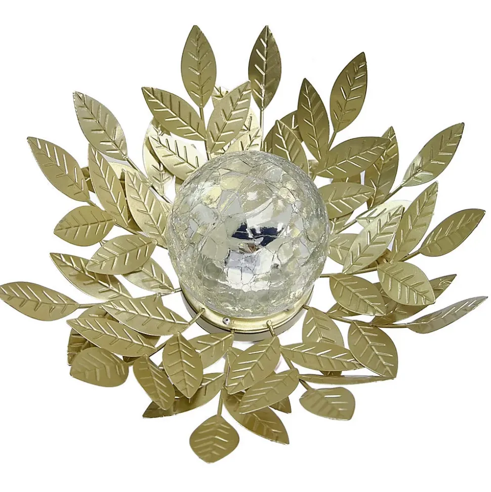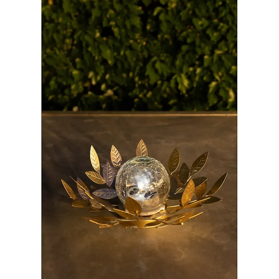 Lampe solaire décorative GALIX G4495 en métal doré et verre craquelé, s’inspirant de la forme d’un nénuphar. Offre une lumière blanche douce de 7 lumens, avec une autonomie allant jusqu’à 8 heures après charge solaire. Equipée d’un interrupteur on/off, idéale pour éclairer jardins et espaces extérieurs avec élégance.