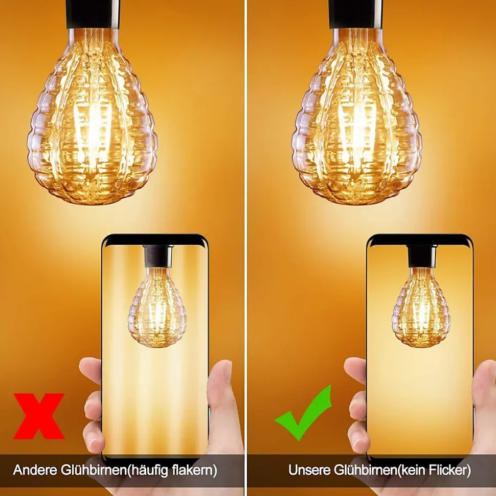 ❥ Économe ❥ : Cette ampoule vintage a une cote d’efficacité énergétique A+ et remplace une ampoule à incandescence classique de 40 W. Sa durée de vie moyenne est de 20 000 heures, soit jusqu’à 90 % d’économie par rapport aux ampoules à incandescence classiques. Grâce à ses filaments LED de haute qualité, la lumière est constante et sans scintillement. Elle ne produit ni rayonnement UV ni IR et ne contient ni plomb, ni mercure, ni autres polluants.❥ Lumière jaune chaude décorative 2700 K ❥ : En plus de sa cote EEK A++, cette ampoule Edison décorative offre une lumière blanche chaude, brillante et chaleureuse, sans danger pour la peau et les yeux, créant une atmosphère chaleureuse et agréable. Remarque : Le verre de la lampe étant doré et sa température de couleur de 2700 K, la lumière émise est jaunâtre. Blanc chaud (environ 2200 K-3500 K)❥ E27 et compatibilité universelle ❥ : Grâce à son culot E27 standard, elle s’installe facilement sur des lustres, des appliques murales, des suspensions, des plafonniers, des lampes de table, etc. Idéale pour votre maison, salle à manger, salon, café, restaurant, musée, galerie d’art et boutiques où vous souhaitez créer une ambiance vintage.❥ Superbe design grenade et style Edison vintage ❥ : Ces ampoules tendance sont soigneusement conçues et décorées en forme de grenade. Le verre doré rétro s’harmonise avec les filaments de style Edison et confère à ces ampoules décoratives un charme rétro-vintage tout en diffusant une lumière douce et chaleureuse.❥ Service client GBLY ❥ : GBLY recommande l’achat de 2 ou 6 ampoules pour une meilleure ambiance décorative. Nous nous efforçons d’offrir à nos clients une expérience d’achat de qualité. En cas de problème avec un produit, veuillez nous contacter rapidement et nous vous fournirons une solution satisfaisante.
