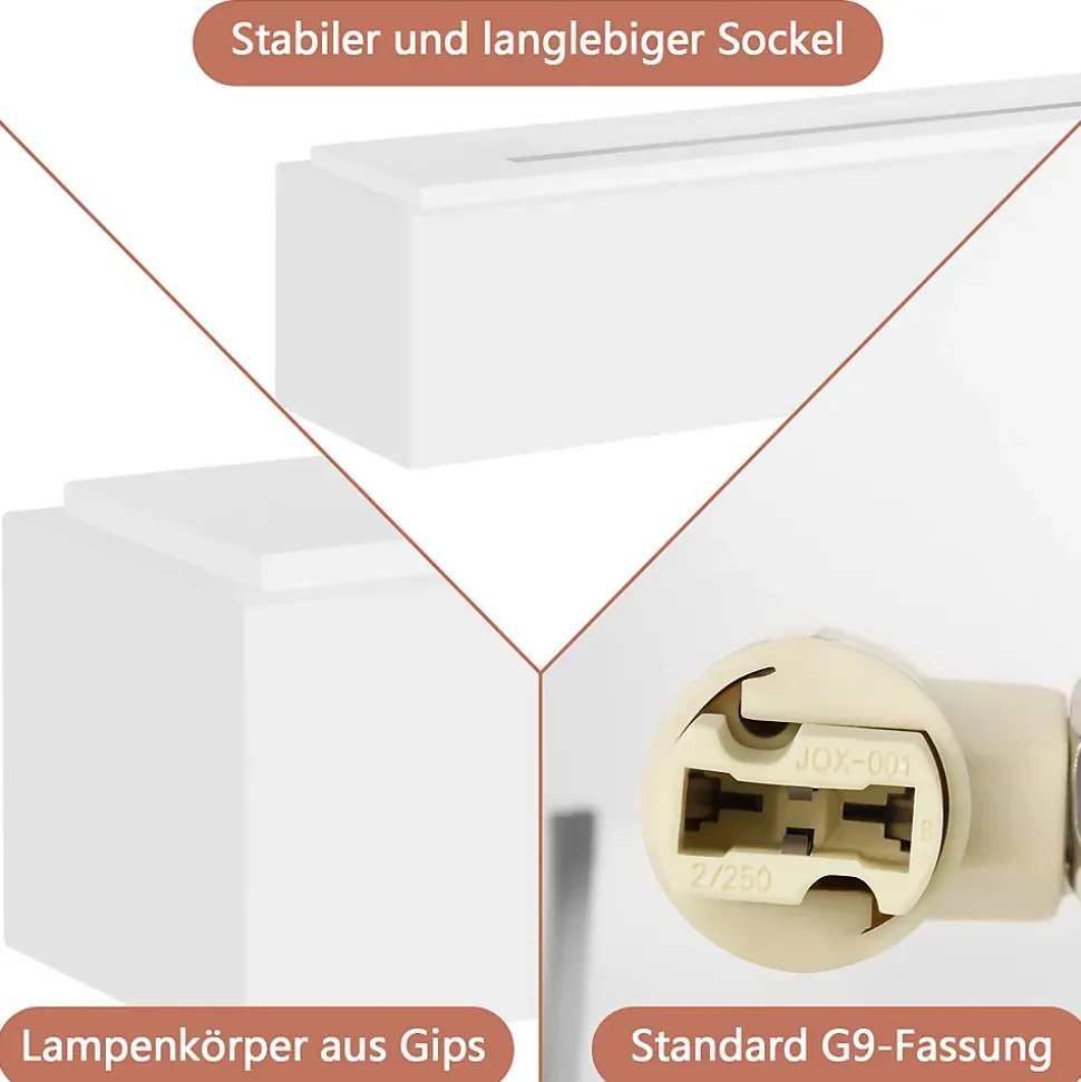 Design moderne : cette applique murale d’intérieur a une forme unique, un savoir-faire exquis rend l’apparence plus à la mode et élégante, en plus de la fonction d’éclairage, elle est également très adaptée à la plupart des styles de décoration intérieureAmpoule G9 remplaçable : convient aux ampoules G9 (non incluses), avec la conception des effets de lumière supérieurs et inférieurs de l’applique murale, vous pouvez choisir la bonne ampoule en fonction des différents besoins d’éclairage et créer un effet d’éclairage mural confortableLarge gamme d’utilisations : le matériau en plâtre qui peut être peint vous permet de bricoler vos lampes préférées pour décorer votre pièce. Cette applique murale moderne est parfaite pour différentes pièces telles que le salon, la chambre, l’escalier, le couloir, le bureau, etc. C’est également un cadeau parfait pour votre famille et vos amisSpécifications du produit : applique murale blanche taille : 52*7,7*8,4 cm, tension 220-240 V, puissance maximale 40 W, non étanche. Fabriqué en plâtre, surface lisse, durable et sans décolorationInstallation facile : Les appliques murales sont fixées au mur, il suffit de suivre nos instructions. Si vous avez des questions sur nos appliques murales d’intérieur, veuillez nous contacter