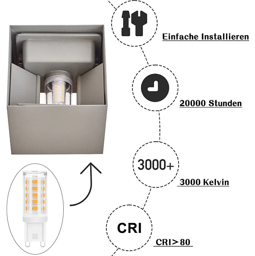▧ Étanche IP65 : cette applique murale extérieure est étanche selon la classe de protection IP65 et donc protégée contre les projections d’eau et la pénétration de poussière. Cela signifie que vous pouvez utiliser la lampe murale à l’extérieur sanscrainte, même par mauvais temps comme la pluie ou la neige.✦ Source lumineuse G9 à double tête interchangeable : cette applique murale est équipée de deux sources lumineuses blanc chaud non graduables. Cependant, vous pouvez acheter les sources lumineuses G9 de votre choix pour personnaliser la luminositéet la couleur de la lumière afin de répondre à vos préférences personnelles et à l’évolution de vos besoins en éclairage.❏ Faisceau réglable : cette applique vous permet de régler l’angle de rayonnement en fonction de vos besoins et de l’environnement pour créer des effets d’éclairage flexibles et sur mesure. Adaptez la lumière à vos préférences personnelles et vivezune expérience d’éclairage unique et immersive.▣ Conception UP et Down : grâce à sa conception unique qui diffuse la lumière par le haut et par le bas, des effets lumineux fascinants sont créés pour rendre votre espace extérieur décoratif et visuellement attrayant. Faites briller votre intérieurextérieur et profitez d’une atmosphère détendue.〇 Beau & fonctionnel : l’aspect élégant s’intègre harmonieusement dans les styles d’architecture et de décoration modernes et le métal de haute qualité avec une surface mate est noble et intemporel. Le luminaire s’intègre parfaitement dans différentsenvironnements et peut être utilisé de manière polyvalente. Que ce soit dans le salon, la chambre à coucher ou le bureau, ce luminaire crée toujours une atmosphère agréable et une ambiance élégante.