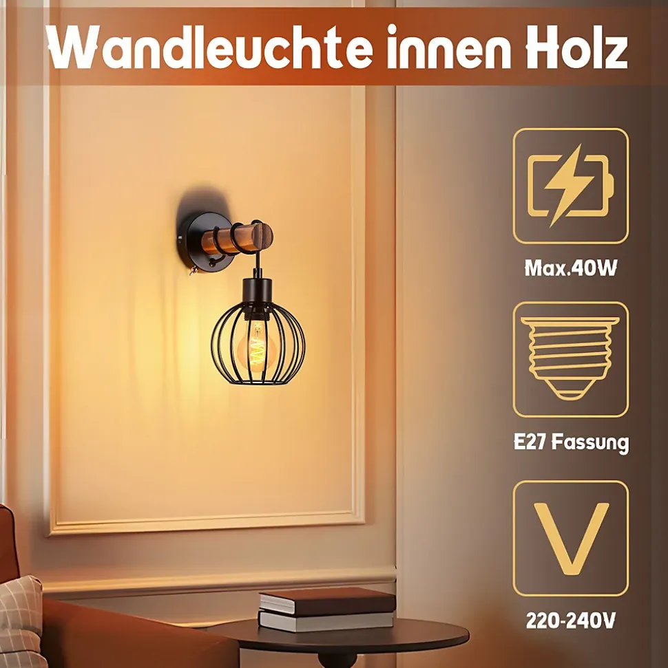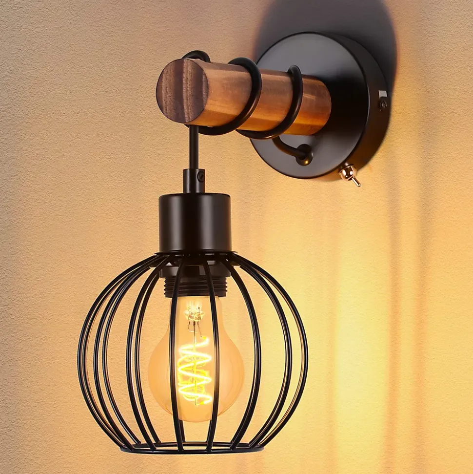 DESIGN SPÉCIAL : Cette applique murale est fabriquée avec soin en métal de haute qualité et en bois naturel, avec une structure métallique robuste et durable. Le câble noir s’enroule autour des poutres en bois foncé, et l’abat-jour cage vintage est suspendu naturellement, créant une silhouette globale superposée et chaleureuse.Association de styles vintage et industriel : Des éléments vintage classiques s’associent à des concepts de design industriel moderne pour créer une atmosphère unique. Pour une touche plus rétro, choisissez des ampoules Edison ou vintage pour un point focal plus accrocheur, que ce soit pour un espace domestique ou commercial (ampoule non incluse).Interrupteur intimiste : La lampe est équipée d’un interrupteur à bascule, éliminant le besoin d’interrupteurs muraux ou de câblage supplémentaire, vous permettant d’utiliser la lumière plus librement et plus facilement. Qu’elle soit installée près du lit, à côté du bureau ou dans l’entrée, un simple interrupteur à bascule allume une lumière chaleureuse.Culot E27 standard : Cette applique murale rétro avec interrupteur est compatible avec une large gamme de sources lumineuses. Équipée d’un culot à vis E27 standard, elle supporte une puissance maximale de 40 W. Vous pouvez choisir librement le type de source lumineuse et la température de couleur adaptés à vos besoins d’éclairage.APPLICATION MULTI-SCÈNES : Cette applique murale vintage convient à une variété d’environnements domestiques et commerciaux, tels que les salons, les chambres, les couloirs, les cages d’escalier, les restaurants, les cafés, les bars, etc. Sa forme unique et sa lumière chaleureuse offrent non seulement un éclairage pratique, mais ajoutent également une esthétique décorative à la pièce, idéale pour créer une atmosphère.