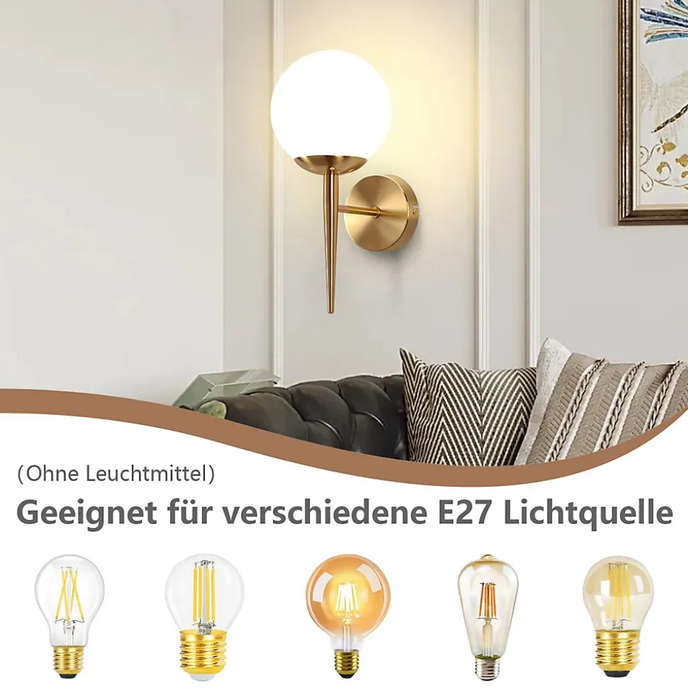Design : Cette applique murale impressionne par la combinaison d’un abat-jour en verre blanc laiteux et d’un métal brillant. Ce n’est pas seulement un appareil d’éclairage fonctionnel et pratique, mais aussi une décoration intérieure sophistiquée. Qu’il s’agisse d’une maison de style vintage ou moderne, cette applique murale s’intégrera sans effort dans n’importe quelle ambiance.Plusieurs sources lumineuses disponibles : Cette applique pour le salon dispose d’une douille E27 qui s’adapte parfaitement à différents styles de maison. Selon vos préférences et besoins personnels, vous pouvez choisir différentes températures de couleur pour créer l’ambiance lumineuse idéale dans la pièce (sans sources lumineuses).Détails : Cette lampe de couloir est équipée d’une douille E27 qui supporte une puissance maximale de 40W. Avec des dimensions de 32*20*15 cm, il est idéal pour l’éclairage décoratif car il ne prend pas trop de place et diffuse une lumière chaude et uniforme qui crée une atmosphère chaleureuse et calme.Installation facile : Cet éclairage est facile à installer. Vous pouvez choisir la meilleure position d’installation en fonction de vos besoins et préférences personnels. Le processus d’installation est pratique : il suffit de placer l’applique murale dans la douille, puis de la visser fermement.Scènes applicables : cette applique murale d’intérieur convient non seulement comme lampe de chevet pour fournir une source de lumière confortable pour lire et se détendre, mais peut également être utilisée dans diverses pièces telles que le salon, le bureau, le couloir, etc. De plus, leur conception simple en fait également un choix idéal pour les lieux publics tels que les hôtels et les cafés.