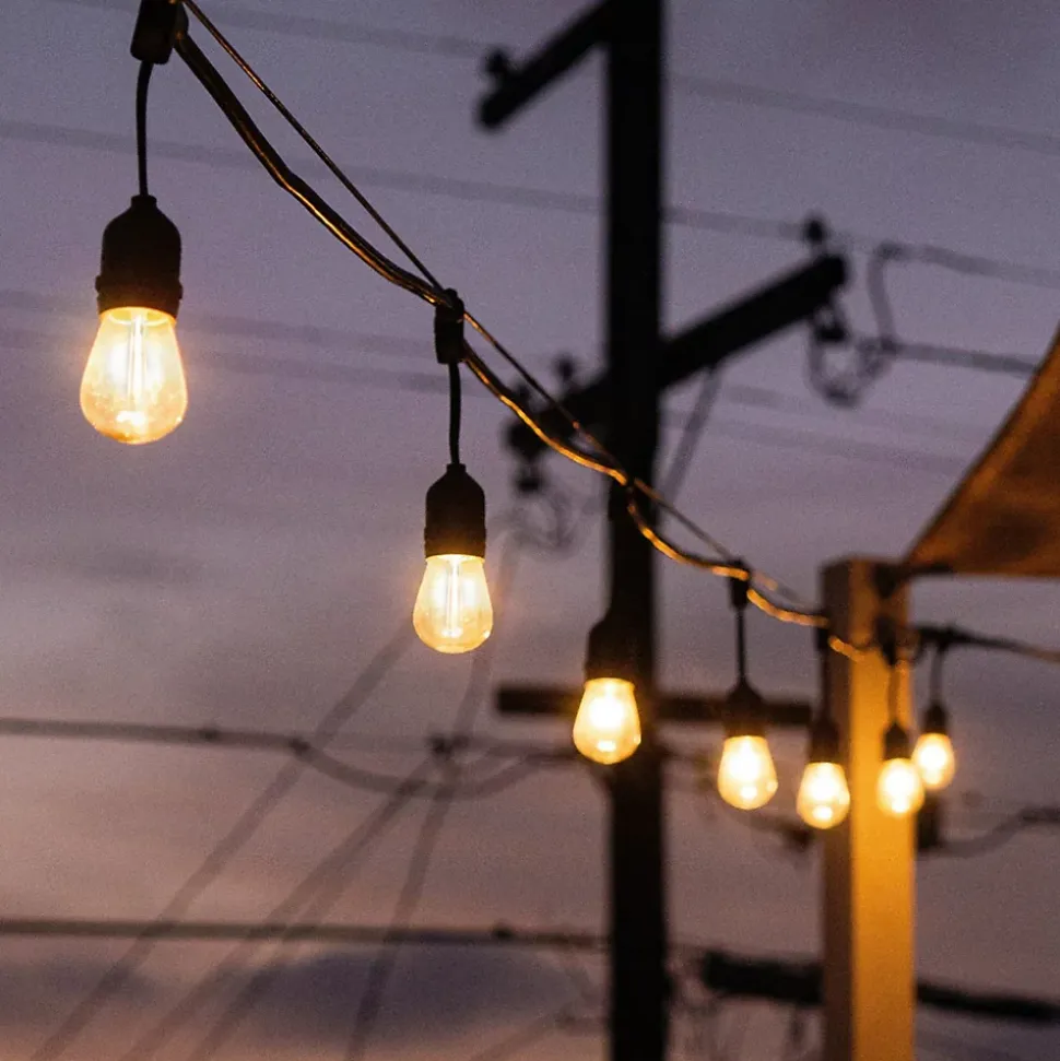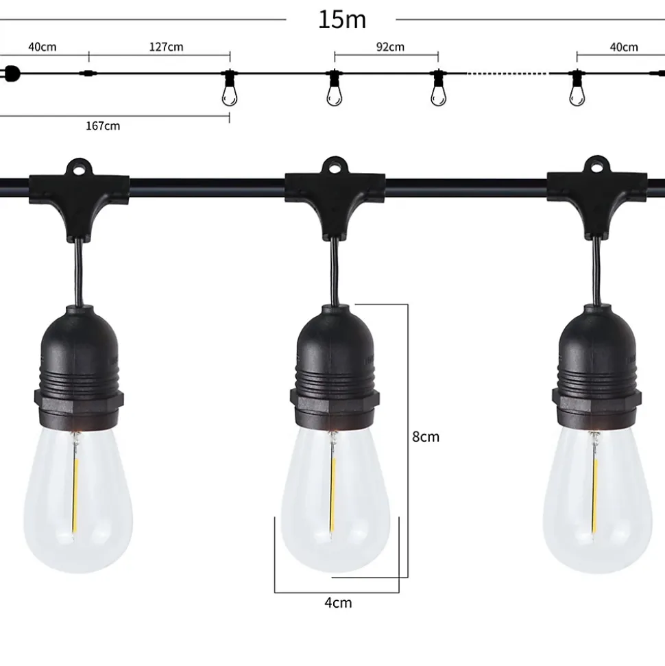 Guirlande lumineuse d’extérieur avec 16 ampoules :Cette guirlande lumineuse d’une longueur totale de 15 m se compose de 16 ampoules résistantes à l’eau de haute qualité (dont 1 lampe de remplacement) et d’un espacement entre les ampoules. La lumière chaude crée une ambiance relaxante et romantique. Parfait pour décorer le jardin, le salon, un mariage, une fête d’anniversaire, Noël, Halloween, etc.Conception de bout en boutLes guirlandes lumineuses de jardin ont une conception de bout en bout, ce qui signifie que vous pouvez connecter plusieurs guirlandes lumineuses pour couvrir une plus grande zone décorative.IP65 étancheL’ampoule des guirlandes lumineuses est conçue pour résister à l’usure que peut provoquer une utilisation en extérieur tout au long de l’année. Ils sont constitués de structures et de matériaux robustes et résistants aux intempéries qui empêchent l’eau et la pluie de pénétrer dans les fils et les ampoules.